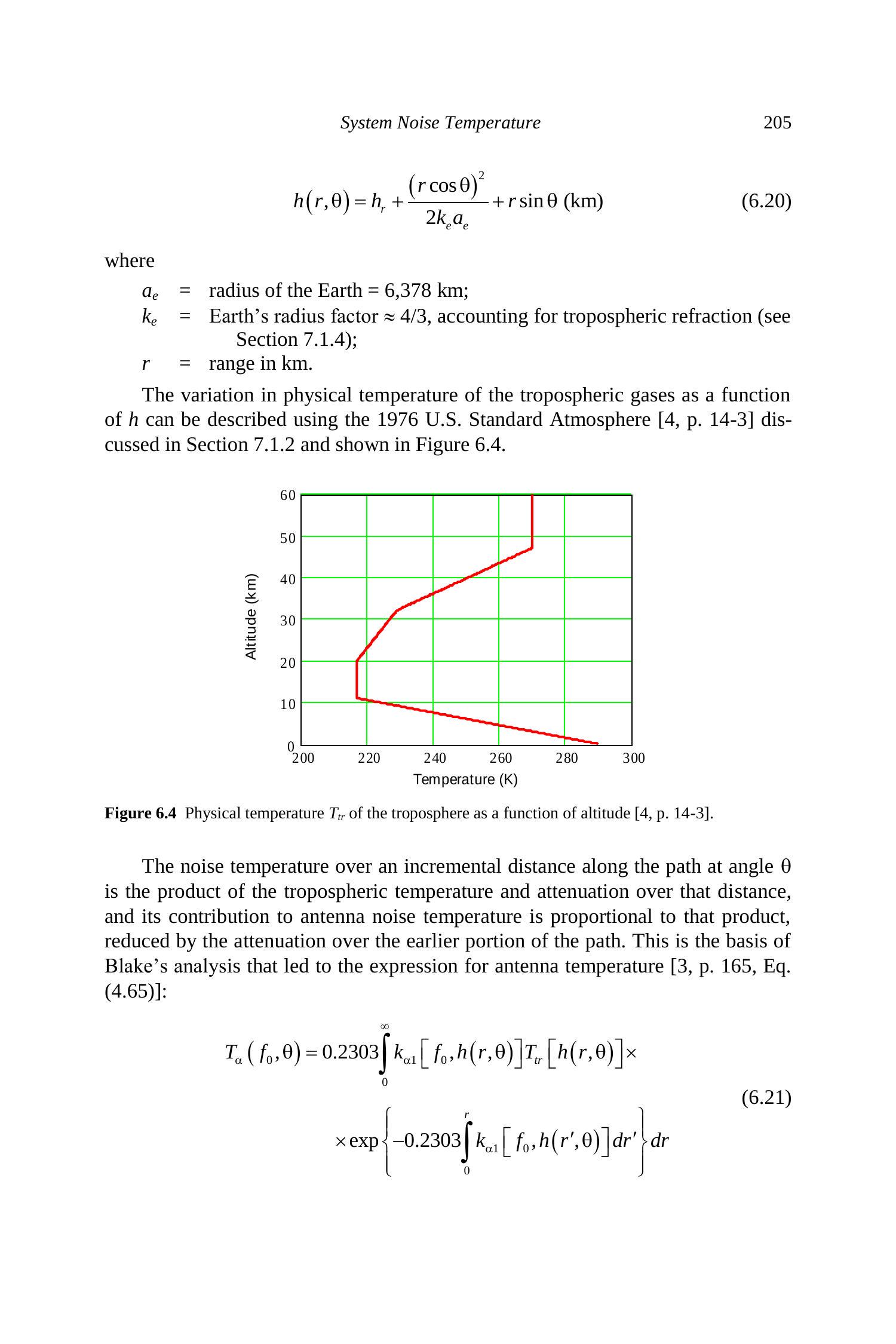对流层气体物理温度随 \(h\) 的变化,可通过 1976 年美国标准大气模型 [4, p. 14-3] 描述(见第 7.1.2 节),如图 6.4 所示。
