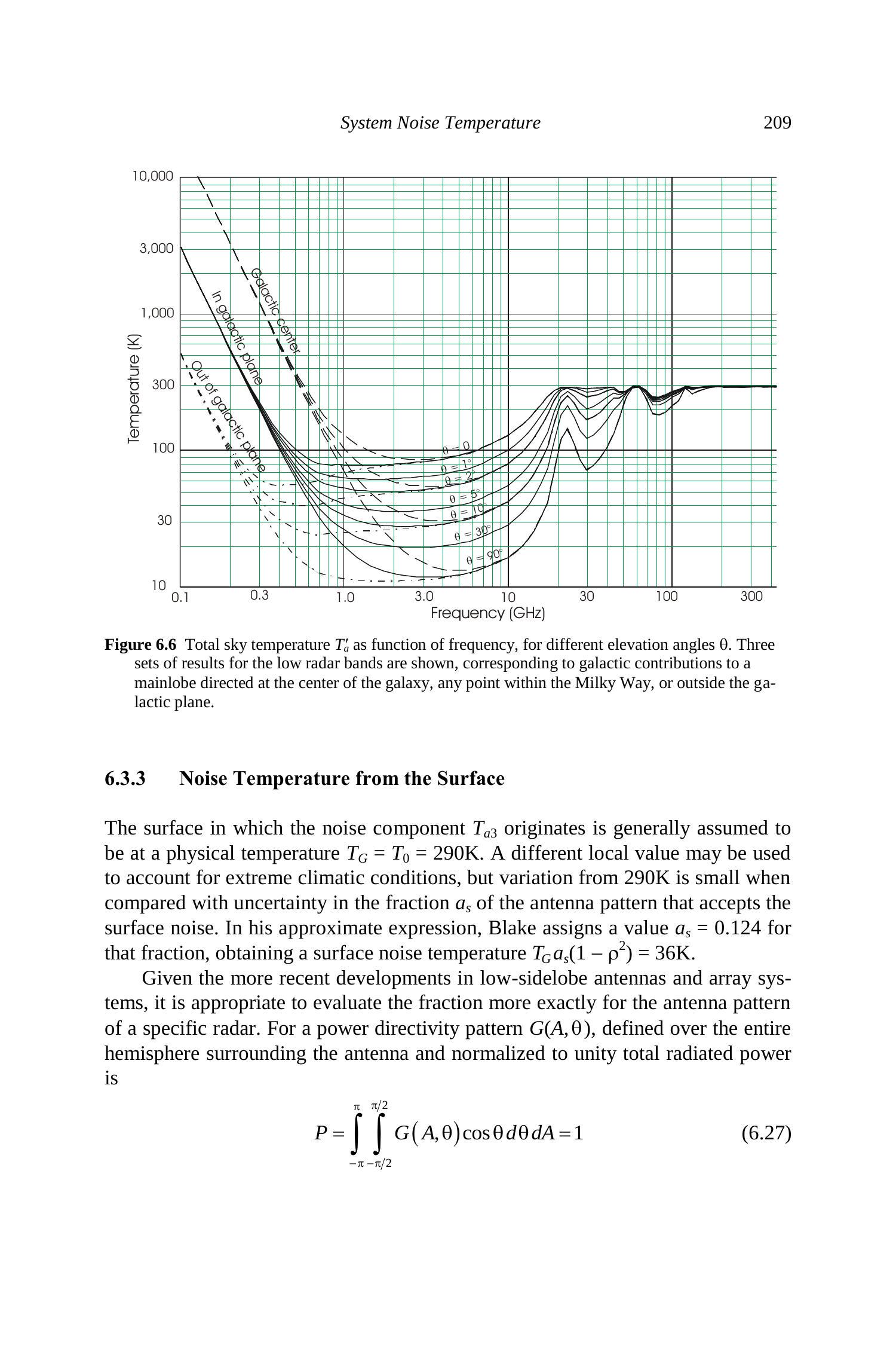 天线噪声的第四个分量 \(T_{a4}\) 源于这些内部损耗。在反射面或透镜天线中通常较小,典型值为 \(L_{a} \approx 0.05 \,\mathrm{dB}\),物理温度 \(T_{p} \approx T_{0}\)。将这些值代入公式 (6.16) 得到 \(T_{a4}=13 \,\mathrm{K}\)。在阵列系统中欧姆损耗来源可能更大,因此噪声温度分量更显著,如下所述。阵列元件通常假设温度 \(T_{p} \approx T_{0}\),但由于发射机射频功率以及移相器控制功率的耗散,温度可能更高。在有源电子扫描阵列(AESA)中,由于馈电与移相器位于 T/R 模块中低噪声放大器(LNA)之后,其损耗效应可以忽略。