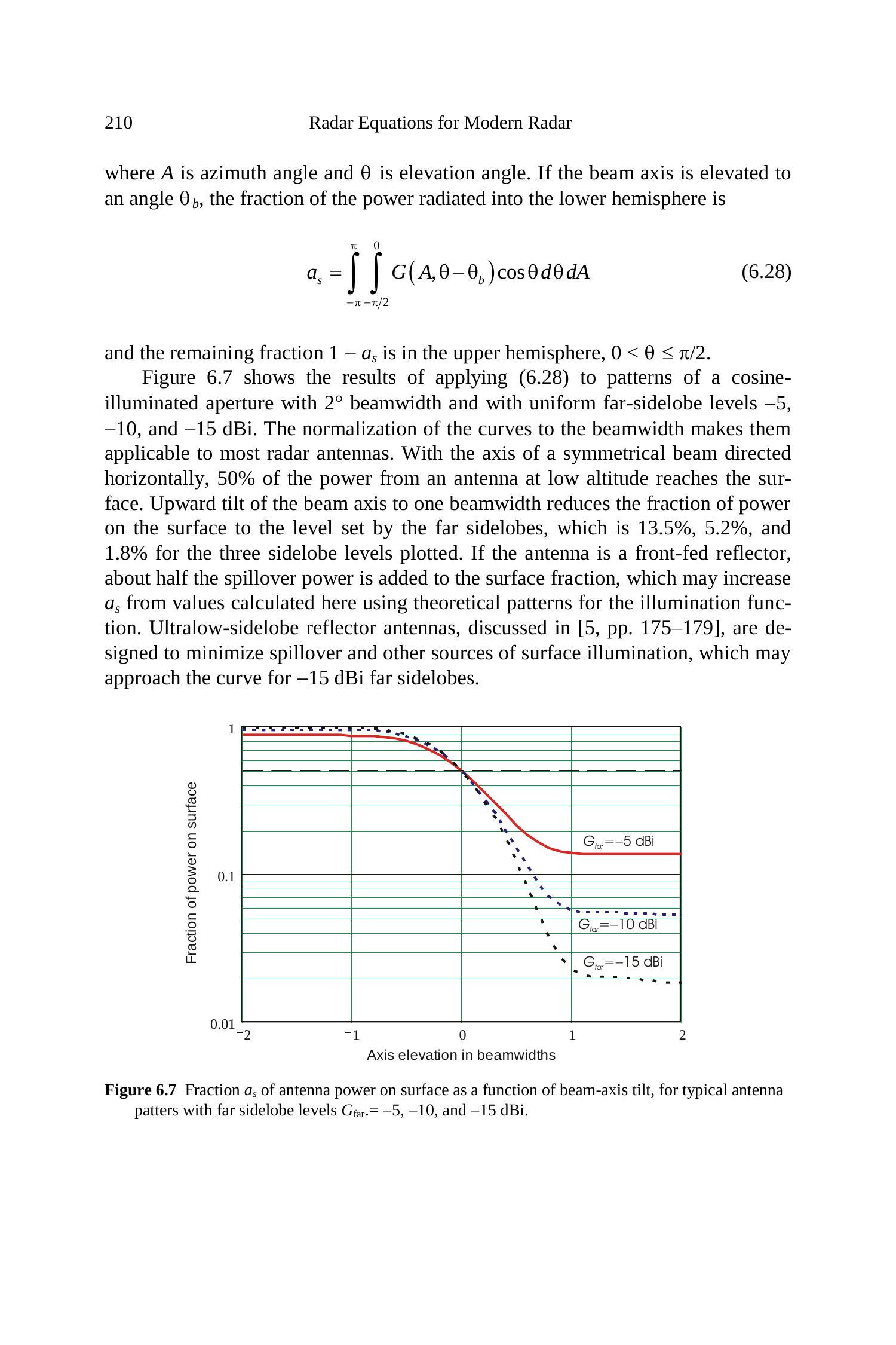 剩余比例 \(1-a_{s}\) 对应上半球,\(0<\theta \leq \pi / 2\)。 图 6.7 给出了公式 (6.28) 应用于余弦加权照明孔径的方向图的结果,其波束宽度为 \(2^{\circ}\),远旁瓣电平分别为 -5、-10 和 -15 dBi。曲线按波束宽度归一化,因此适用于大多数雷达天线。当对称波束的轴水平指向时,低空天线约有 \(50\%\) 的功率照射到地表。若波束轴上仰一个波束宽度,则到达地表的功率比例将下降至由远旁瓣决定的水平,分别为 \(13.5\%\)、\(5.2\%\) 和 \(1.8\%\)。若天线为前馈反射面天线,则大约一半的溢出功率也会加到地表分量上,使 \(a_{s}\) 高于理论照明函数方向图计算的值。文献 [5, pp. 175-179] 讨论的超低旁瓣反射面天线旨在最大限度减少溢出和其他地表照射源,其结果接近 -15 dBi 远旁瓣曲线。