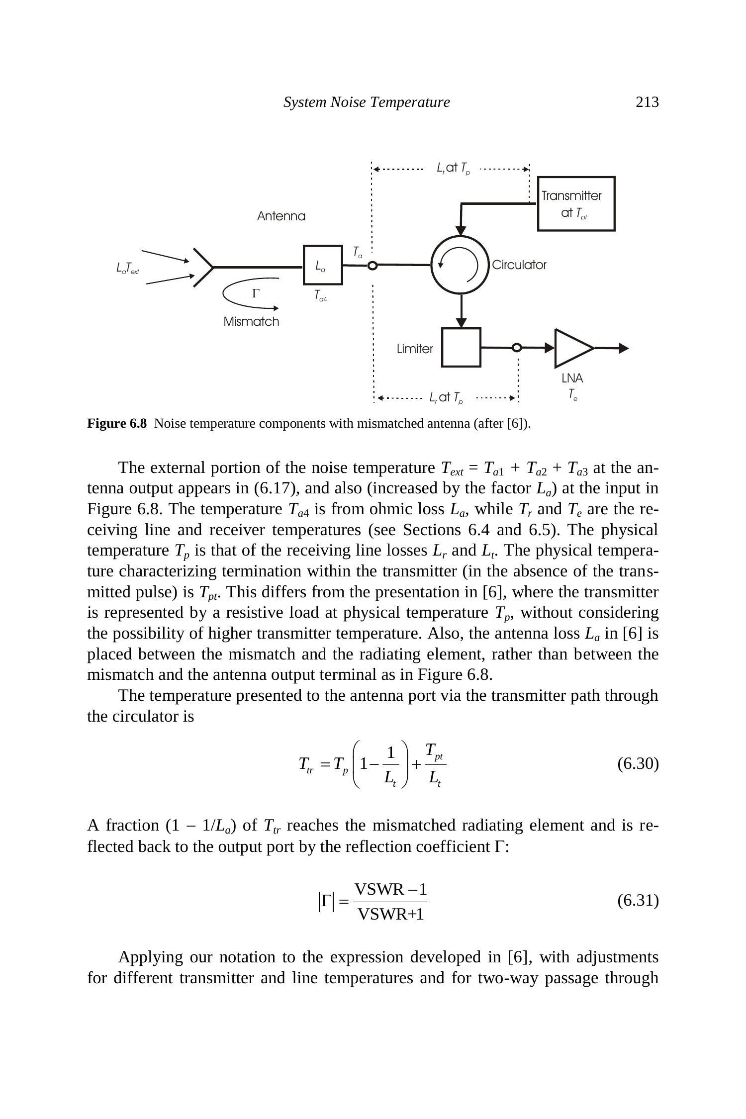 当将 \(T_{e}\) 参照到天线端口时,它需乘以接收线损耗 \(L_{r}\),从而给出接收机对系统温度的贡献(见公式 (6.10))。