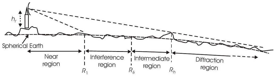 - 干涉区,\(R_{1}<R<R_{\delta}\),反射波与直射波发生干涉;