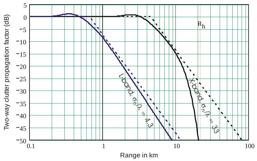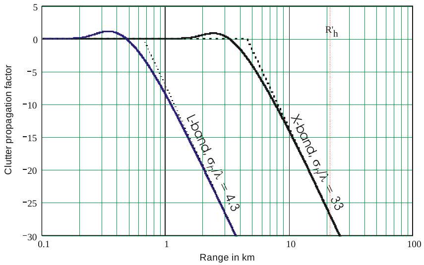 其中 \(h_{c} \approx 3 \sigma_{h}\) 为主要杂波散射体高于平均表面的高度。在图9.2所示条件下,X波段时 \(R_{\delta}=8.9 \mathrm{~km}\),L波段时 \(R_{\delta}=1.8 \mathrm{~km}\)。超过这些距离后,\(F_{c}^{\prime}\) 的曲线将开始偏离干涉值,如后文所示。