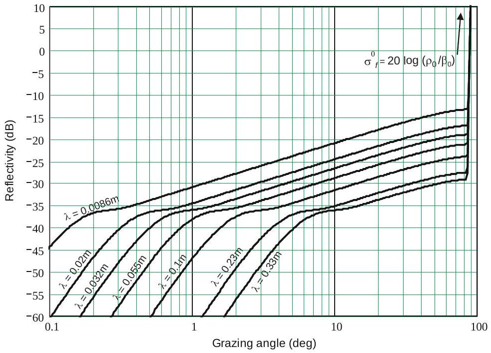 表面杂波反射率的测量实际上是 \(\sigma_{c} F_{c}^{4}\) 的乘积。因此,若要将 \(\sigma^{0}\) 建模并应用于其他雷达和传输路径,就必须已知适用于测量几何与天线的 \(F_{c}^{4}\) 值。为了解释构成本章第9.2–9.4节模型的实测数据,假设在计算报告的反射率时已经考虑了天线方向图效应,并且报告的 \(\sigma^{0}\) 实际上是 \(\sigma_{c} F_{c}^{\prime 4}\) 的乘积,除非在少数情况下 \(F_{c}^{\prime}\) 被明确作为单独因子处理。