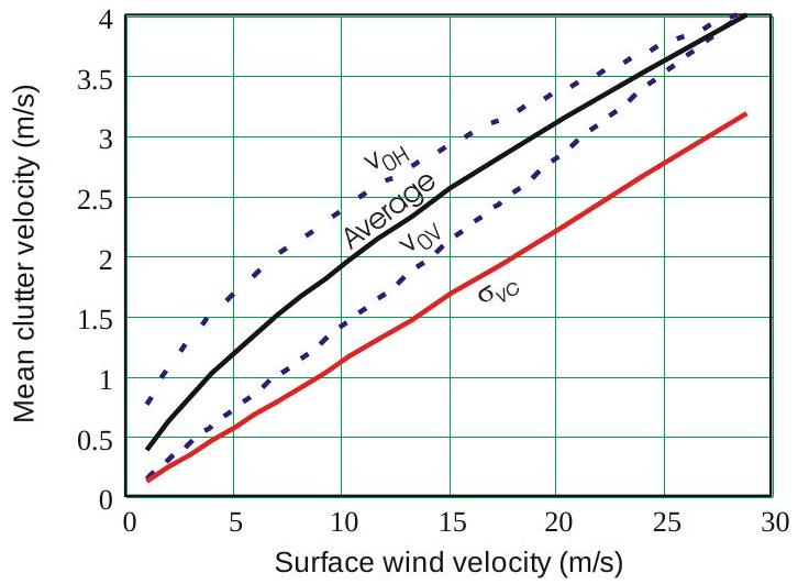 其中,\(\sigma_{v c}\) 为杂波速度的标准差(单位 \(\mathrm{m} / \mathrm{s}\)),\(C\) 为杂波功率(单位 W)。平均速度可能来自于运动平台的观测,或风对海面的作用。[4] 及其后续文献报道的半功率谱宽值将在后续不同类型杂波的章节中讨论。