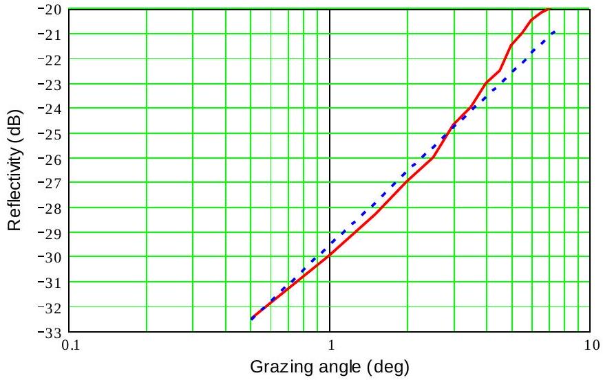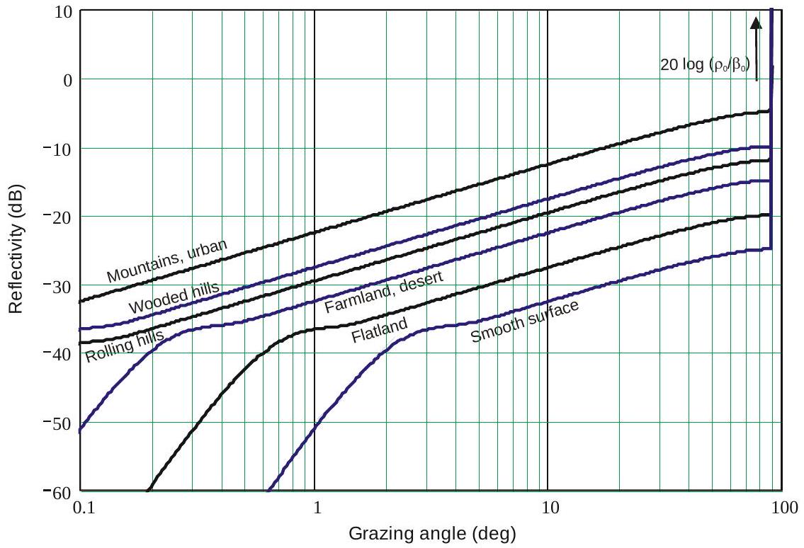 反射率最好建模为固有杂波反射率 \(\gamma\) 与雷达波束到达表面时的局部掠射角 \(\psi\) 的正弦的乘积:
