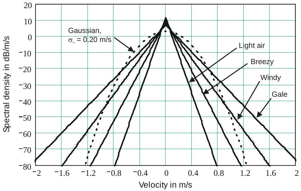 关于海杂波频谱的测量在 [4, p. 579] 中被报道为“近似呈高斯形状”。在林地环境下的地杂波测量显示其与高斯形状有偏差,但包含一个由零速度下的冲激函数表示的稳态分量。