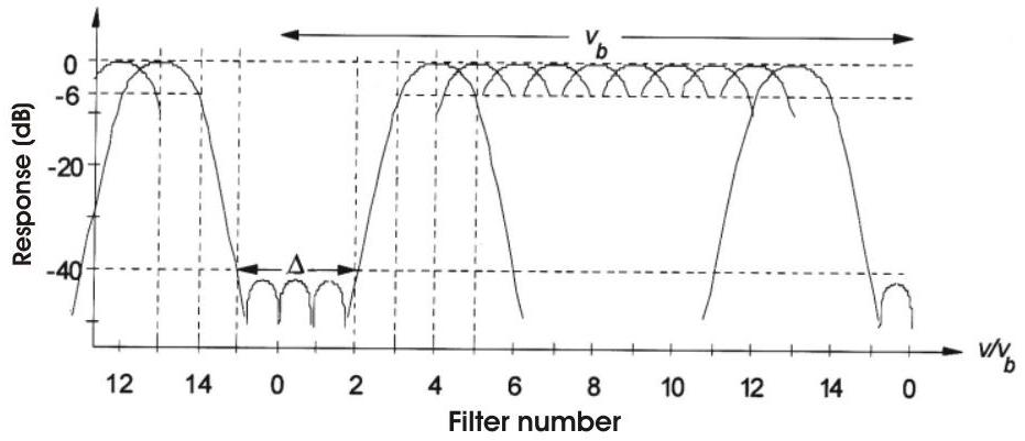 在实际中,理想化的响应通常通过一组多普勒滤波器近似实现,如图 9.14 所示,其中包含显著杂波的若干滤波器被降敏(例如通过距离单元平均 CFAR),以形成深陷口。输入信号的加权使滤波器旁瓣低于抑制口的水平。敏感滤波器的响应包络形成目标检测区域,其中滤波器间的凹陷会引入小的滤波器跨越损失(见第 10.2.5 节)。盲口两侧过渡区的宽度约等于滤波器间隔 \(v_{b} / n_{p}\),而单个滤波器的 \(-6~\mathrm{dB}\) 宽度是该间隔的两倍。