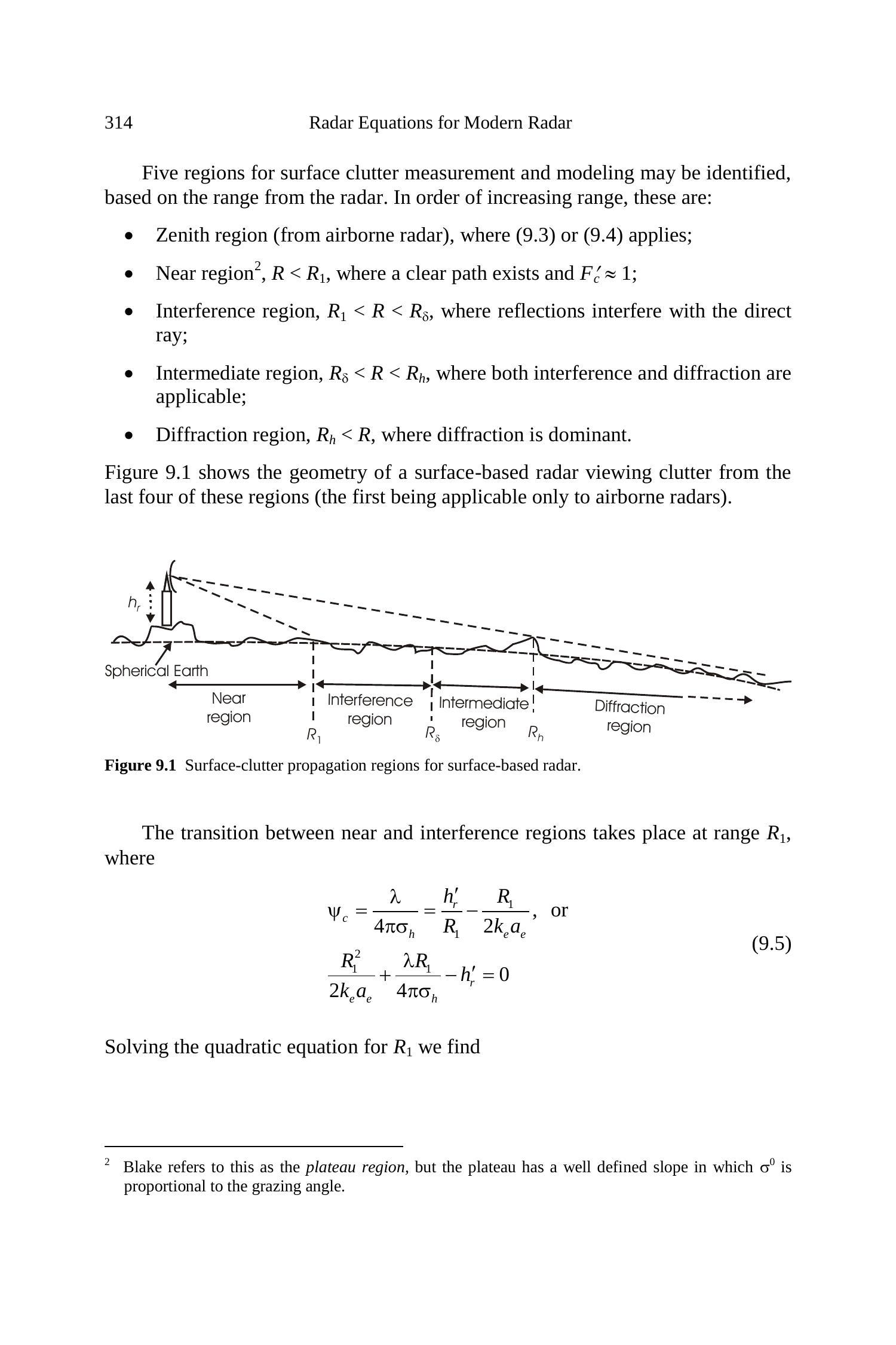图9.1展示了地基雷达从上述后四个区域观察杂波的几何关系(第一个区域仅适用于机载雷达)。