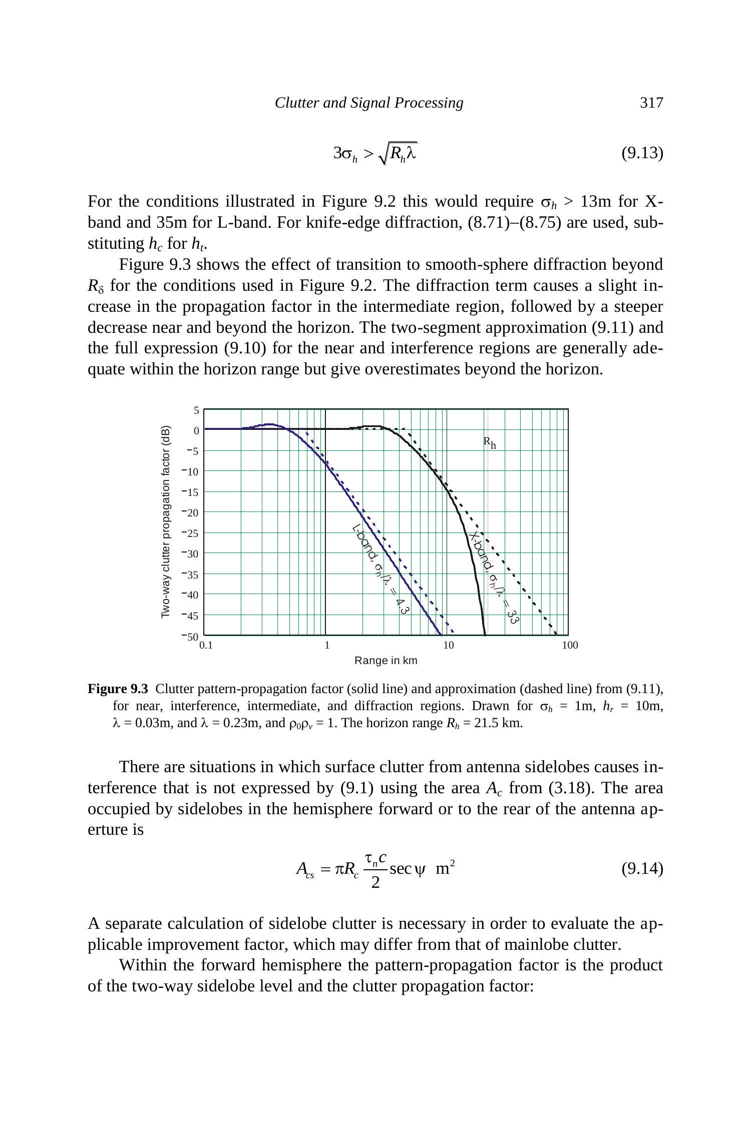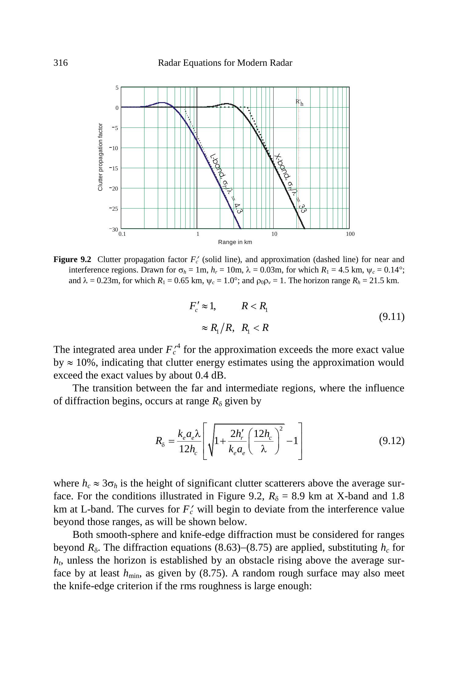 在图9.2条件下,X波段需 \(\sigma_{h}>13 \mathrm{~m}\),L波段需 \(\sigma_{h}>35 \mathrm{~m}\)。刀口衍射情况下,使用(8.71)–(8.75),并将 \(h_{c}\) 代入 \(h_{t}\)。