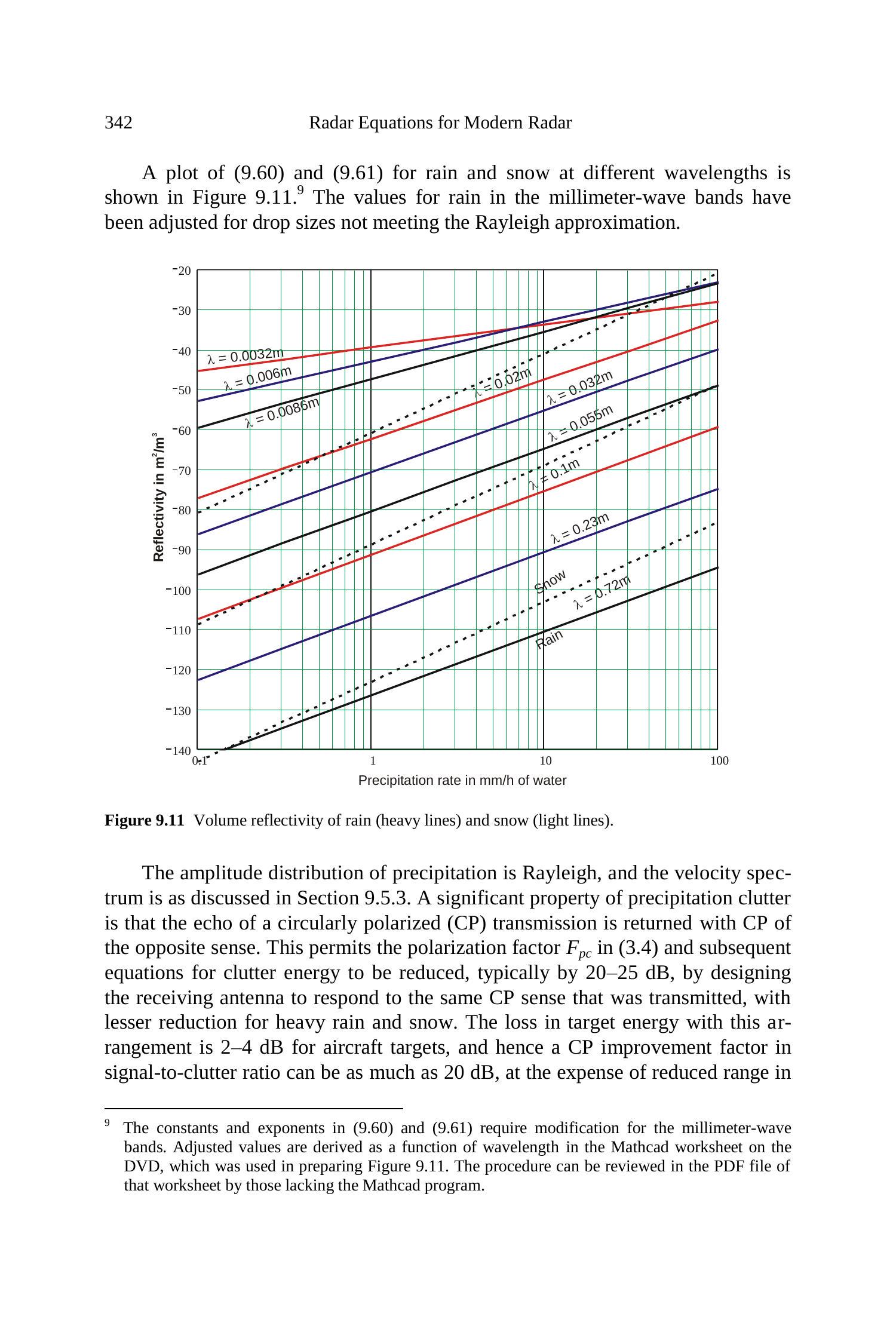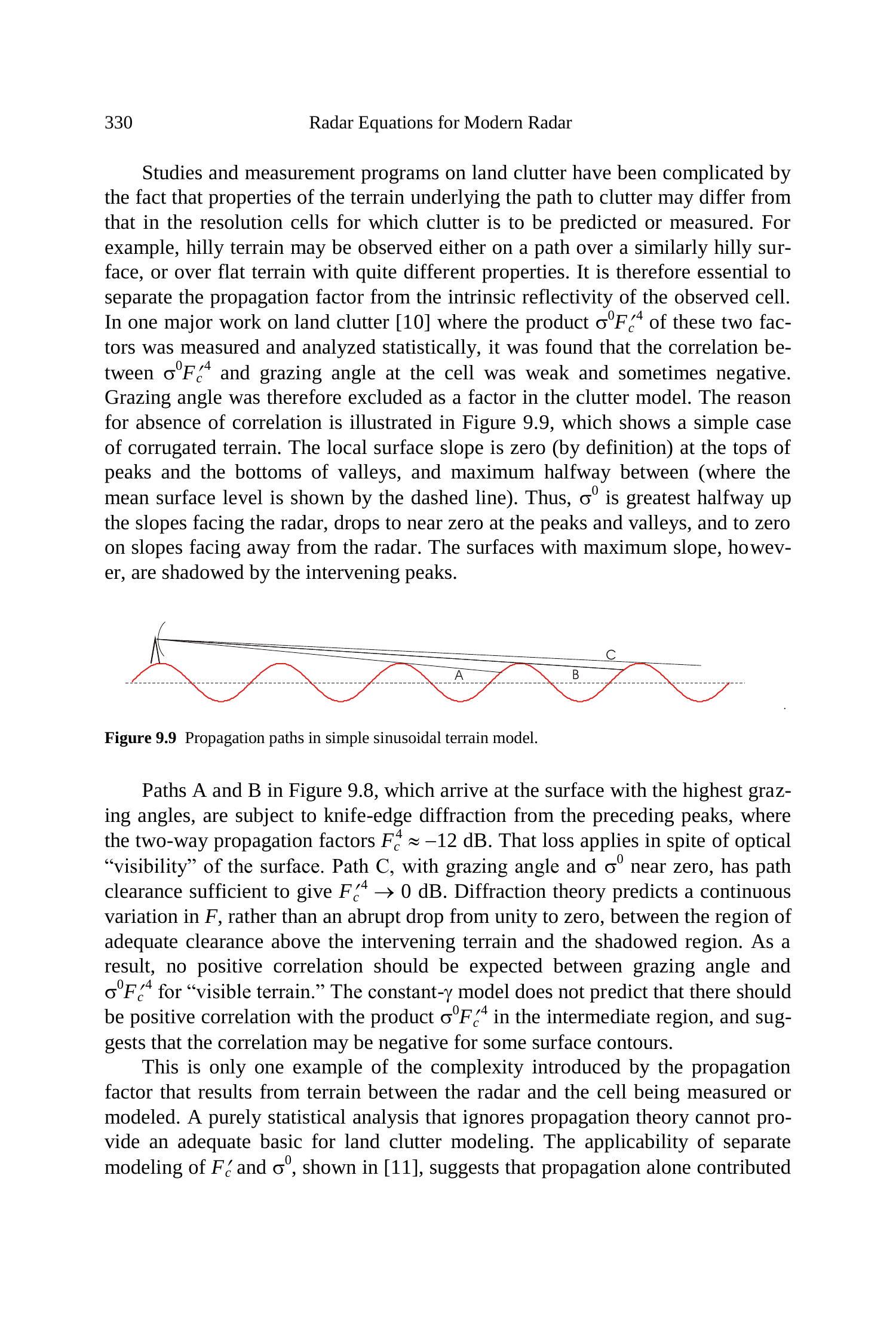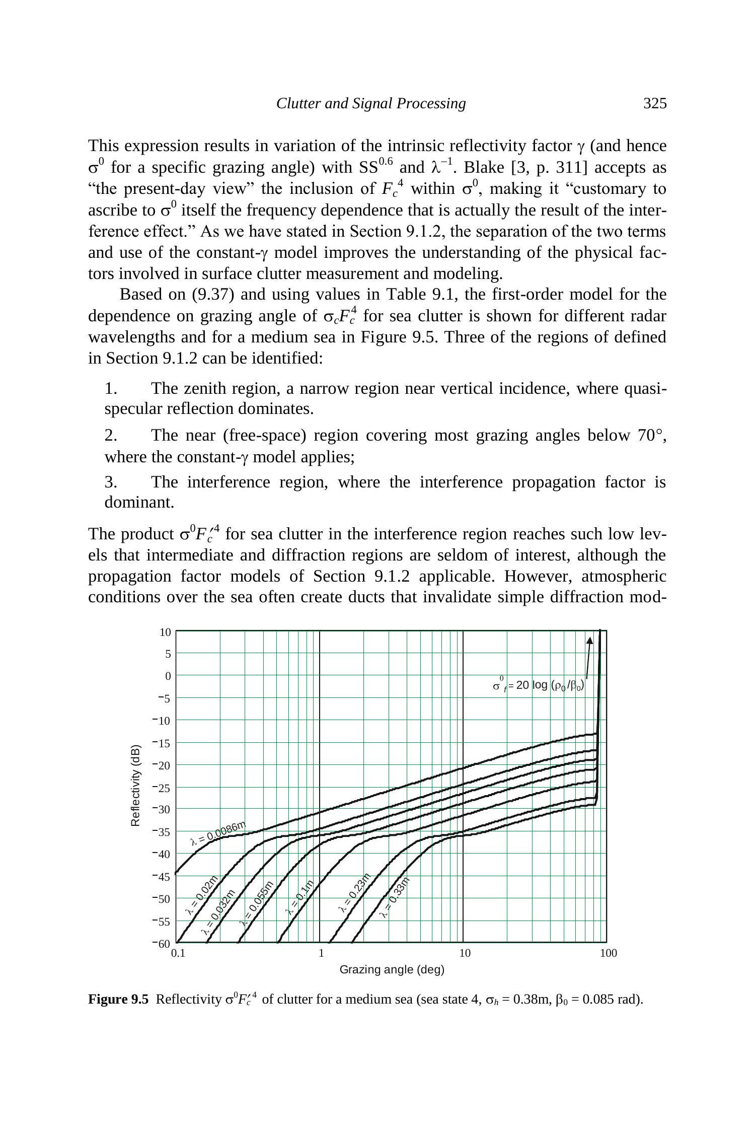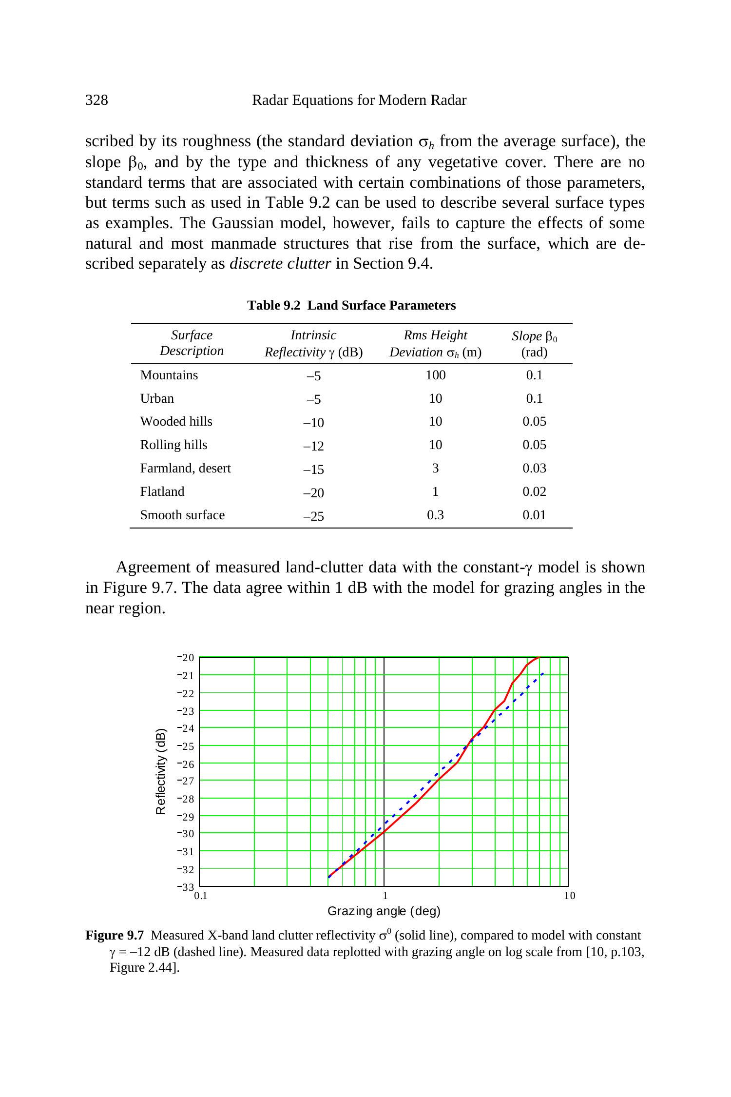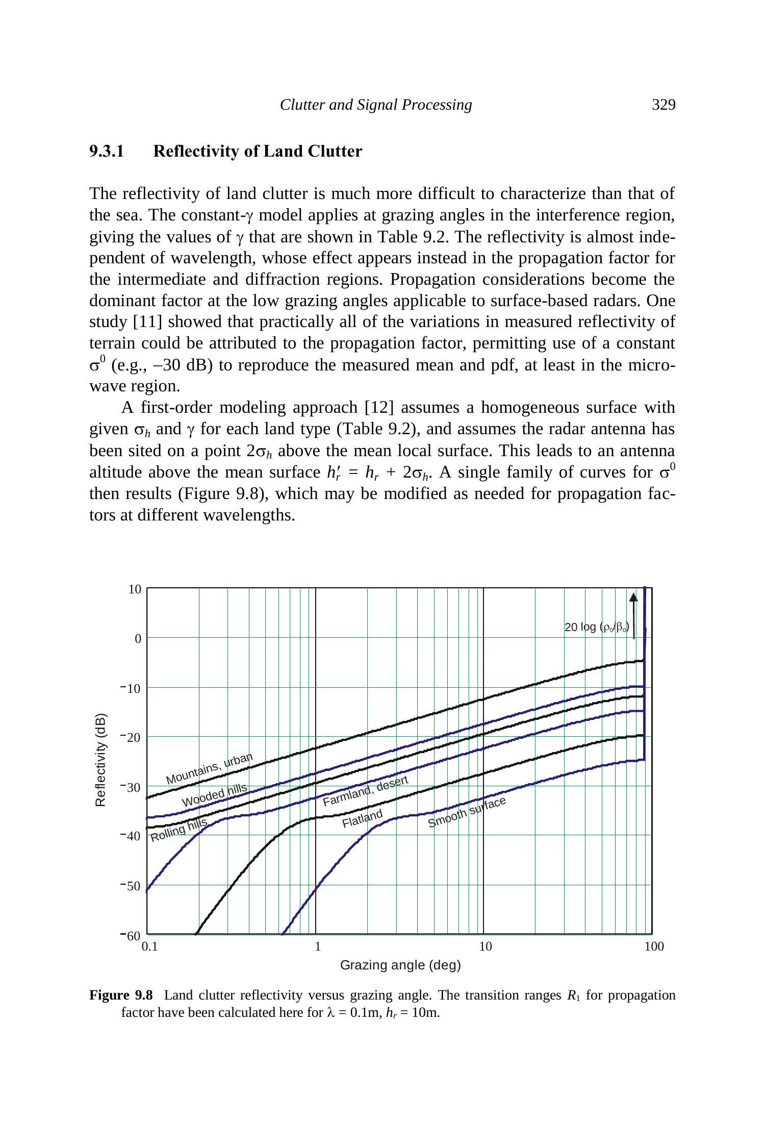 该常数- \(\gamma\) 模型在与第9.1.2节中讨论的杂波传播因子结合使用,并且 \(\psi\) 不接近 \(90^{\circ}\) 时通常适用。由(9.1)和(9.2)所描述的反射率源于雷达波与小尺度表面特征相互作用,这些特征会将入射波的一小部分散射回源端。为了描述当 \(\psi \rightarrow 0\) 时杂波的持续存在,有时在(9.2)中加上一个数量级约为 \(10^{-6}\) 的小常数,或如文献 [1, p. 405] 中所述,在掠射角 \(\psi\) 上加上 0.0001 弧度的增量。这些方程不适用于由支持镜面反射的表面散射的情况,例如第3.5节讨论的某些人造目标所导致的离散杂波,或接近垂直入射时的表面杂波。