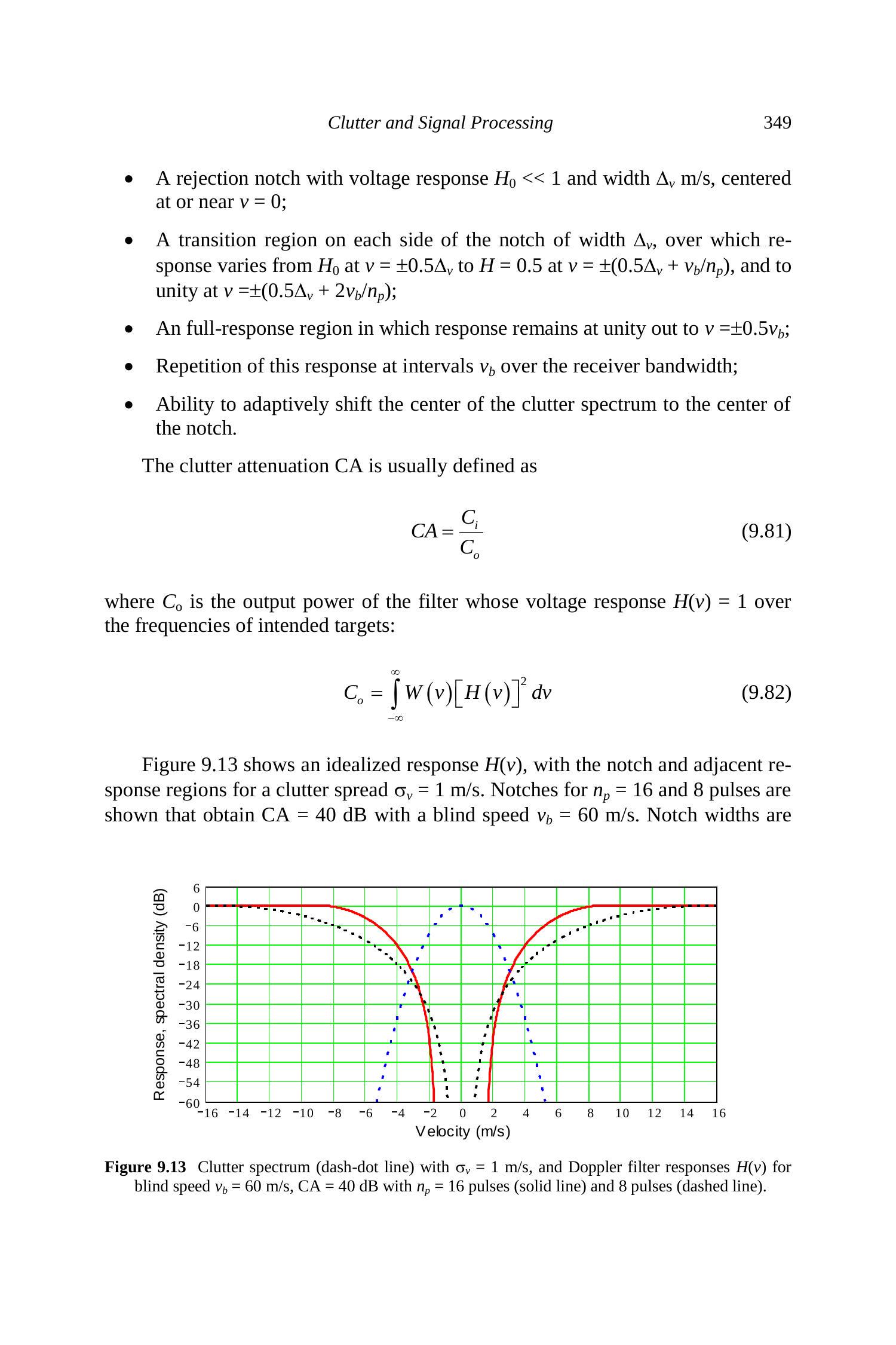 图 9.13 给出了理想化响应 \(H(v)\),用于 \(\sigma_v = 1~\mathrm{m/s}\) 的杂波扩展。16 脉冲和 8 脉冲的凹口分别得到 \(CA = 40~\mathrm{dB}\),盲速 \(v_b = 60~\mathrm{m/s}\),凹口宽度分别为 \(\Delta_v = 3.1\) 和 \(1.1~\mathrm{m/s}\)。更多脉冲可以获得更陡的响应并减少过渡区宽度,从而改善目标响应覆盖盲速的比例。