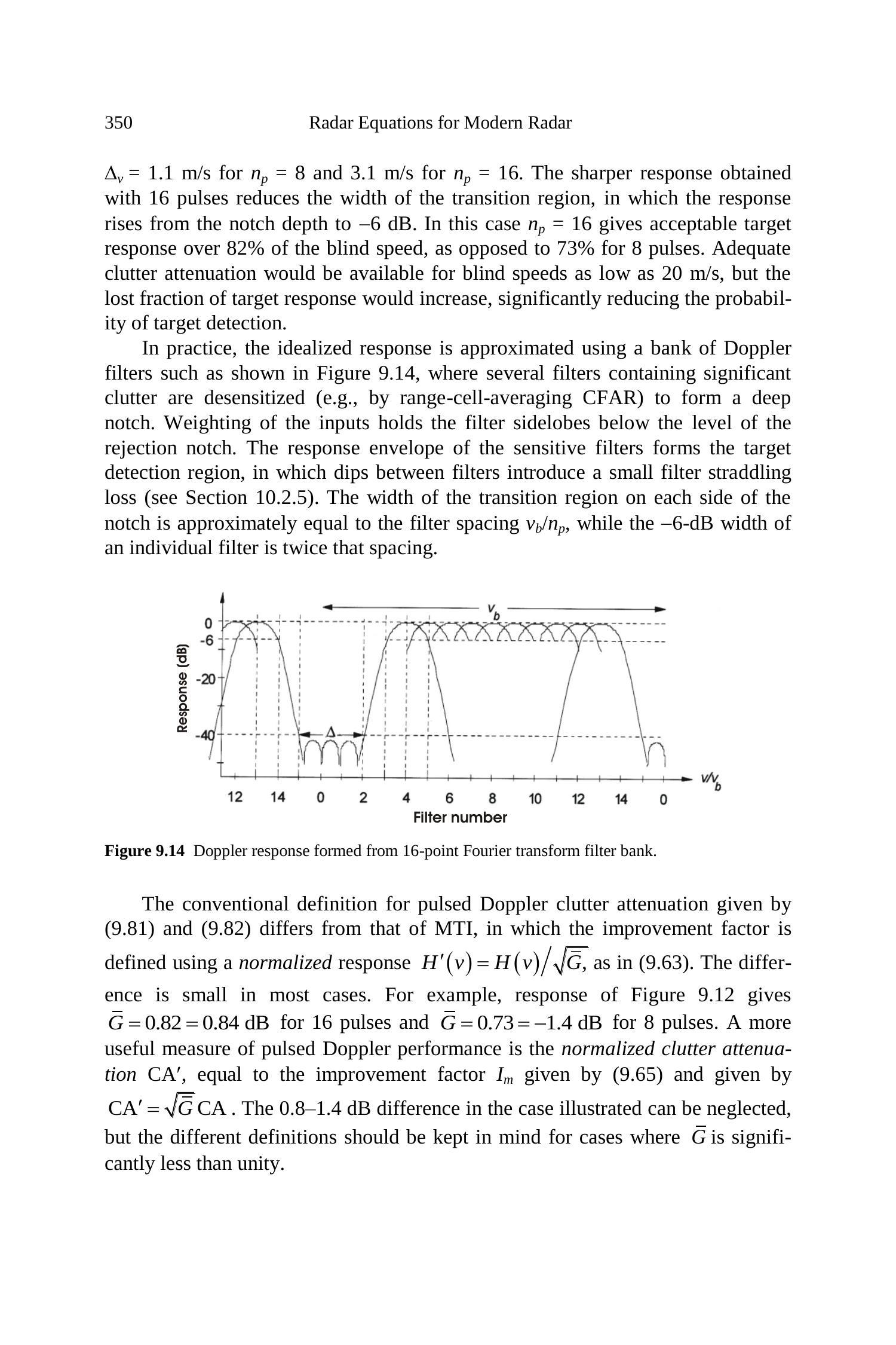 脉冲多普勒杂波衰减的常规定义(公式 9.81 和 9.82)与 MTI 的定义不同,后者中改进因子使用归一化响应 \(H^{\prime}(v)=H(v) / \sqrt{\bar{G}}\)(见公式 9.63)来定义。在大多数情况下,这种差异较小。例如,图 9.12 的响应对于 16 脉冲 \(\bar{G}=0.82=0.84~\mathrm{dB}\),对于 8 脉冲 \(\bar{G}=0.73=-1.4~\mathrm{dB}\)。脉冲多普勒性能的更有用度量是归一化杂波衰减 \(\mathrm{CA}^{\prime}\),等于公式 (9.65) 所给的改进因子 \(I_{m}\),即 \(\mathrm{CA}^{\prime}=\sqrt{\bar{G}} \mathrm{CA}\)。在所示情况下 \(0.8-1.4~\mathrm{dB}\) 的差异可以忽略,但在 \(\bar{G}\) 明显小于 1 的情况下应注意定义差异。