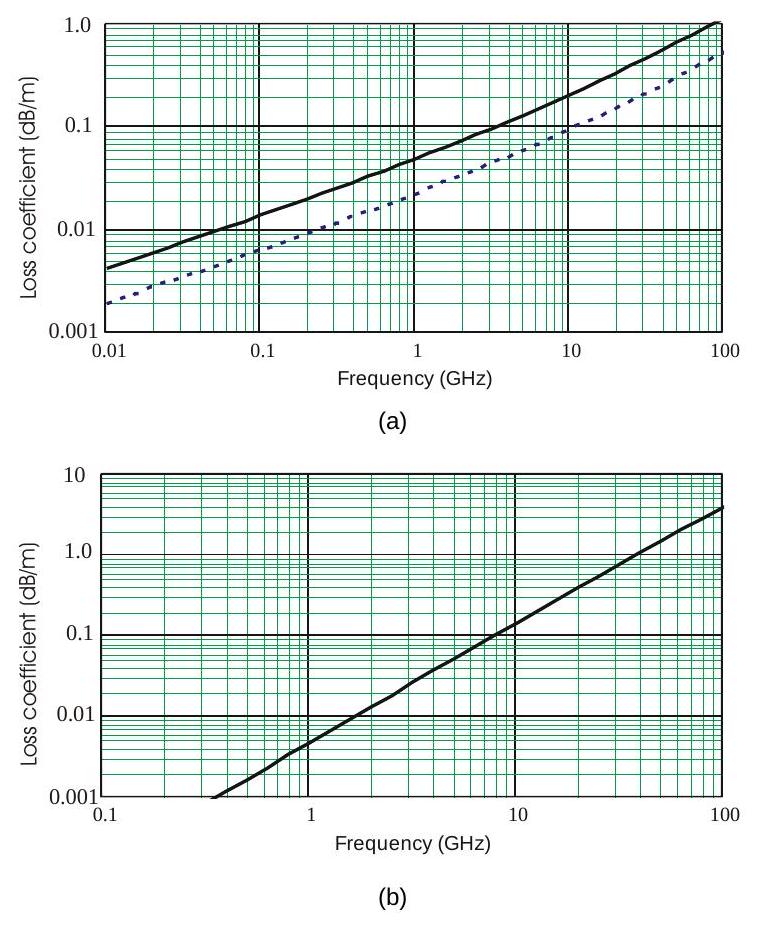 图10.1 (a) 刚性同轴传输线与 (b) 矩形波导的损耗随频率变化情况,数据来自文献 [2]。