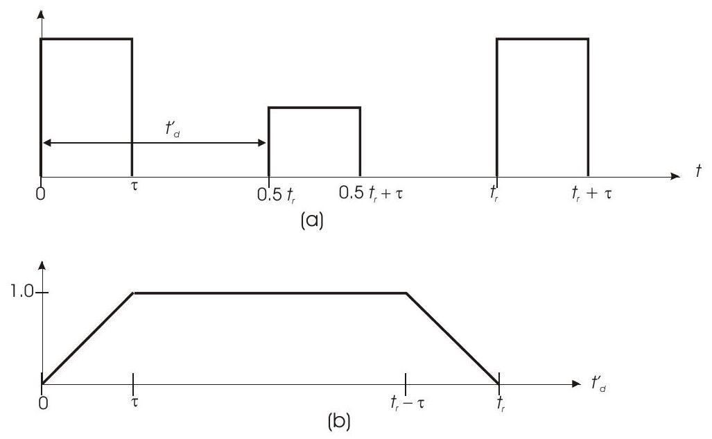 图10.2 中 (a) 显示了两个连续发射脉冲,间隔为脉冲重复间隔 PRI \(=t_{r}\),以及延迟为 \(t_{d}^{\prime}=0.5 t_{r}\) 的回波脉冲。对于延迟满足 \(\left|0.5 t_{r}-t_{d}^{\prime}\right|>0.5 t_{r}-\tau\) 的信号,会发生遮蔽。图 (b) 显示了未被遮蔽的回波脉冲分数。该分数表示为: