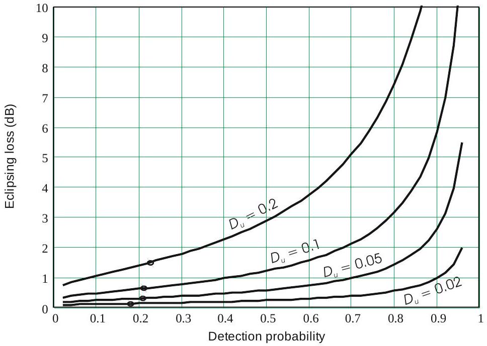 脉冲多普勒速度响应损耗 \(L_{vr}\)。在低/中 PRF 雷达中,目标速度可能超过盲速,PRF 多样性用于填充响应不足的区域,以保证对别名至 \(\pm \Delta_v / 2\) 的目标的探测性能。输入信号能量比必须增加以在指定速度区域获得期望平均 \(P_d\),该增加即为速度响应损耗。没有通用公式,但若将图10.4的蝕降损耗曲线中的占空比 \(D_u\) 替换为滤波器响应低于 -6 dB 的速度分数,也可表示速度响应损耗。