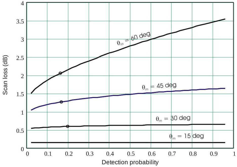 在现代软件控制雷达系统的分析、设计和运行中,准确考虑系统损失随搜索和目标获取策略的变化非常重要。例如,通过减小波束位置间距可以降低波束形状损失,但代价是需要分配更多的发射能量和雷达时间来搜索特定扇区。重复扫描体积、每次扫描的 \(P_{d}\) 较低且波束间距较大,可能比进行一次高 \(P_{d}\) 扫描所需的总能量和时间更少,尤其是针对波动目标。最优策略需要在第 5 章讨论的波束形状损失与本章讨论的统计损失之间进行仔细平衡。通过对距离-多普勒空间进行更密集的采样以避免跨界损失,可以降低信号处理损失。与两个角坐标采样引起的波束形状损失不同,这种方法不涉及增加发射能量或搜索时间,只需更高的处理吞吐量和存储容量。随着摩尔定律降低所需数字硬件的成本,这种过采样在硬件获取、体积、重量和功耗方面的成本也随之下降。