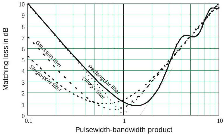 - 多普勒滤波匹配损耗 \(L_{mf}\)。相对于在相干积分时间 \(t_f\) 内接收的脉冲列包络匹配的滤波器的损耗。它取决于在 \(t_f\) 内应用的加权以获得所需滤波器旁瓣水平。对于给定旁瓣水平的滤波器性能,可使用图10.7的曲线,将脉宽因子替换为滤波器带宽因子,并通过效率曲线计算损耗: