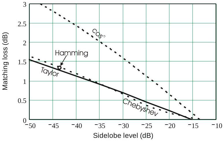 同轴线和波导的损耗系数见图10.1。在使用每个单元有发射/接收模块的阵列中,\(L_{t}\) 可能仅包括双工器和失配损耗。失配损耗由下式给出: