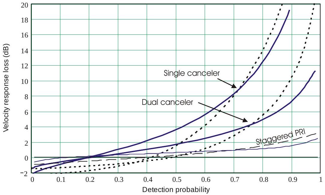 图10.12 MTI 速度响应损耗随探测概率变化(实线为 Case 1 目标,虚线为稳态目标)。来源:[1]。