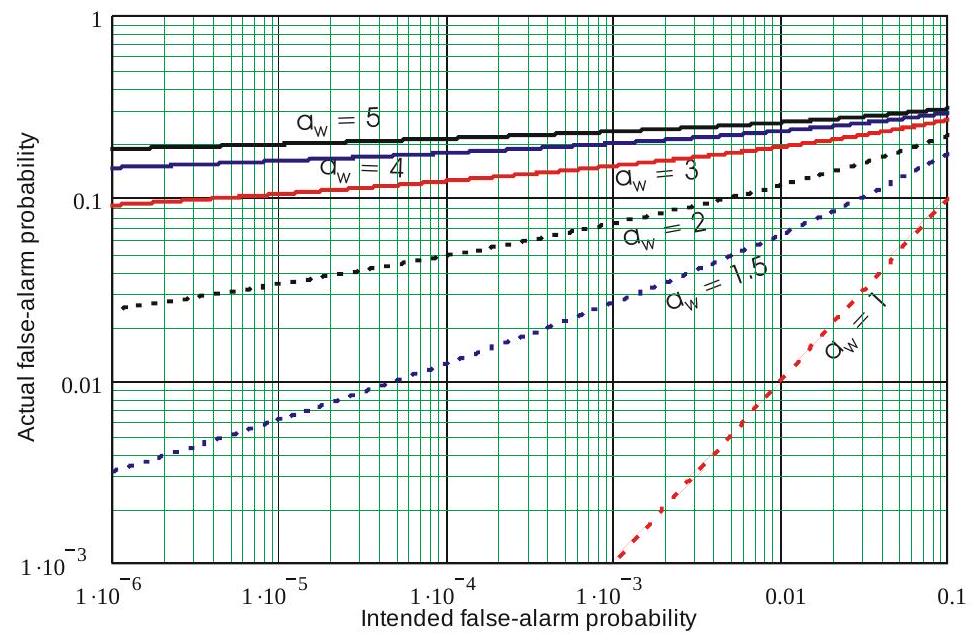 其中 \(x\) 为功率,\(a_{w}\) 为 Weibull 展宽参数,取值范围 \(1 \leq a_{w} \leq 5\)。指数功率分布(Rayleigh 电压)对应 \(a_{w}=1\)。对于 \(a_{w}>1\) 的 Weibull 杂波,相对于 (10.44) 中给出的 \(p_{\text {th}}\),阈值上升了 \(\Gamma\left(1+a_{w}\right)=a_{w}\) 倍,这表示平均杂波功率与假设为 1 的尺度参数 \(\alpha\) 之比。然而,当 \(a_{w}>1\) 时,\(p_{t h}\) 的增加不足以维持预定的误警概率 \(P_{f a w}\),其为:
