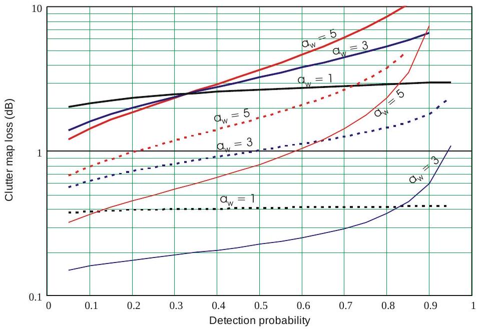 图 10.17 显示了杂波地图损失随不同杂波环境下 Case 1 目标所需检测概率的变化。例如,假设 \(I_{m}=40 \mathrm{~dB}\),平均输入杂波噪声比为 \(C_{0}/N_{0}=+30\) dB,得到 \(c-10 \mathrm{~dB}=0.1\)。图 10.17 中的虚线曲线表明,对于 Rayleigh 杂波(\(a_{w}=1\)),可在地图损失仅 0.41 dB 下实现 \(P_{d a v}=80\%\),\(a_{w}=3\) 时损失升至 1.6 dB,\(a_{w}=5\) 时升至 3.8 dB。检测概率为 90% 时,Rayleigh 杂波的地图损失仅 0.42 dB,而 \(a_{w}=3\) 时为 1.9 dB,\(a_{w}=5\) 时约为 7 dB。这些损失远小于其他误警控制方法。该地图还有两个优点:支持 MTI 或多普勒滤波前的所有电路线性工作,使这些电路能够达到理论改进因子(见第 9.6 节);在用于选择 MTI 或常规视频处理时,它允许在无杂波单元中检测零径向速度目标,因为可以根据每个单元的实际杂波水平选择处理路径。