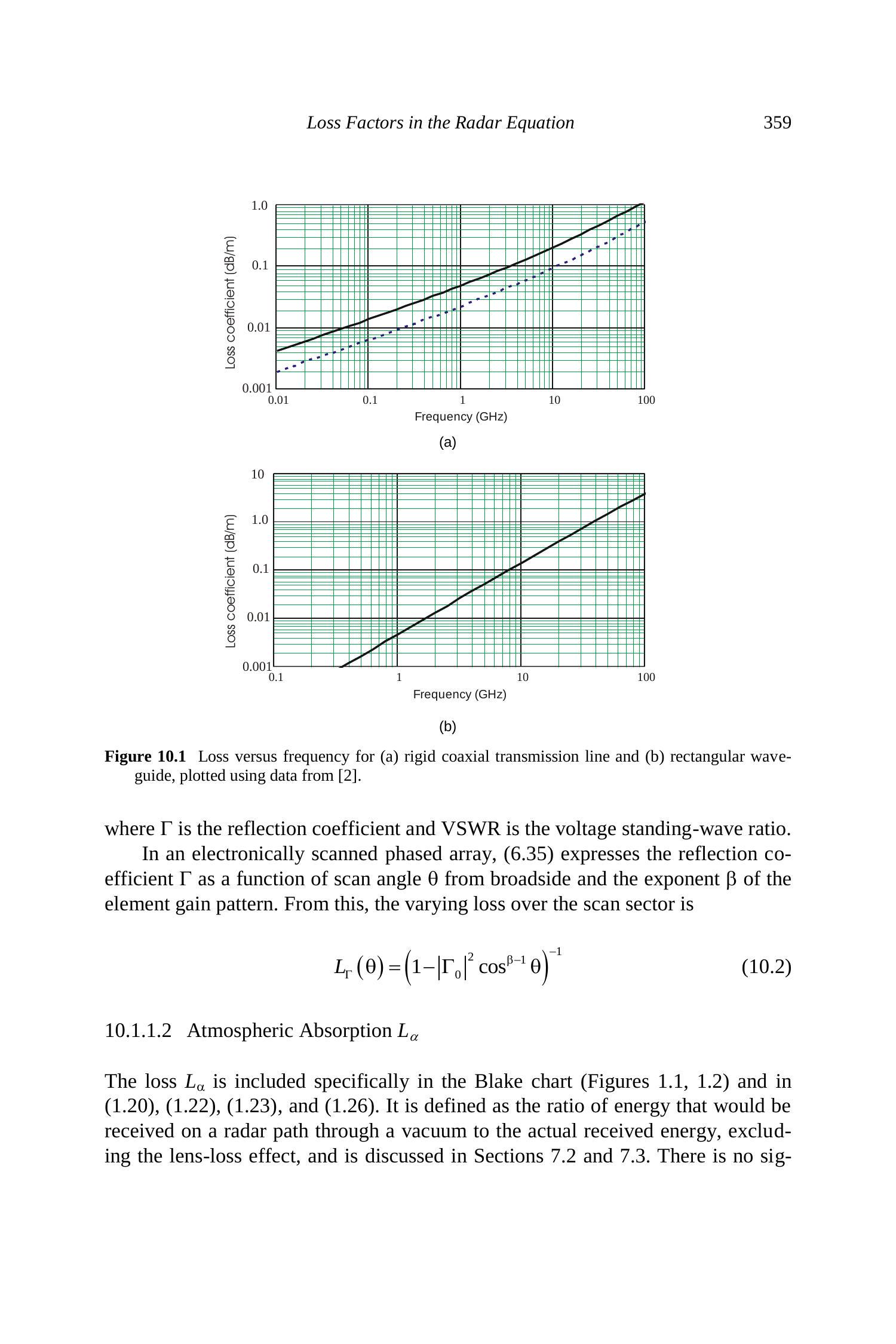 同轴线和波导的损耗系数见图10.1。在使用每个单元有发射/接收模块的阵列中,\(L_{t}\) 可能仅包括双工器和失配损耗。失配损耗由下式给出: