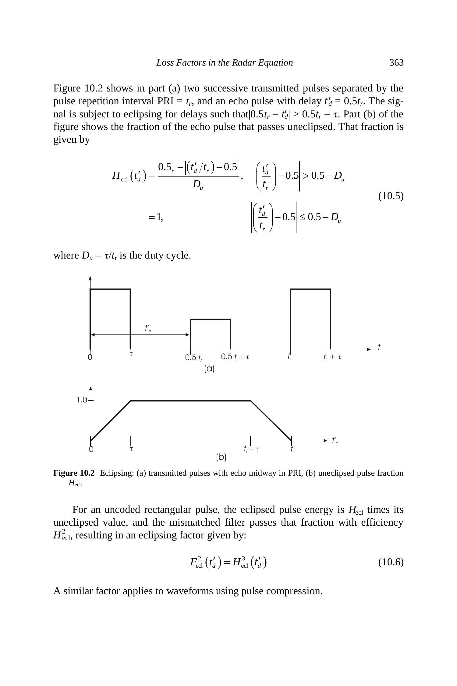 图10.2 中 (a) 显示了两个连续发射脉冲,间隔为脉冲重复间隔 PRI \(=t_{r}\),以及延迟为 \(t_{d}^{\prime}=0.5 t_{r}\) 的回波脉冲。对于延迟满足 \(\left|0.5 t_{r}-t_{d}^{\prime}\right|>0.5 t_{r}-\tau\) 的信号,会发生遮蔽。图 (b) 显示了未被遮蔽的回波脉冲分数。该分数表示为: