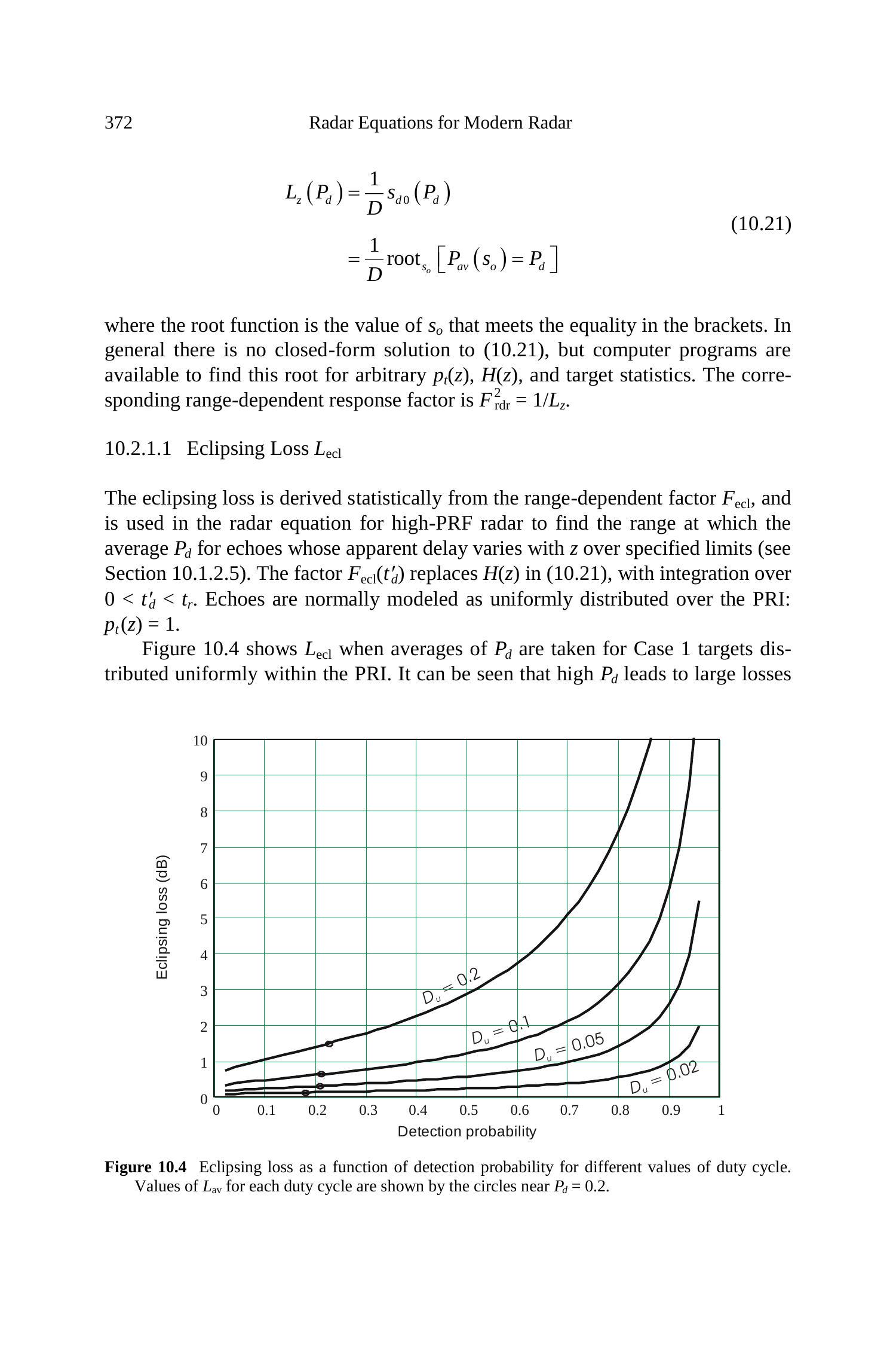 在低/中 PRF 且使用恒定 PRF 的雷达中,可将公式 (10.6) 给出的确定性因子作为目标距离函数应用,从而产生靠近发射脉冲的可识别区域,其中 \(P_{d}\) 降至接近零(见图1.4)。在高 PRF 雷达中,目标快速通过遮蔽区域,通常在每个波束驻留期间使用 PRF 多样性,以移动这些区域并保留部分目标回波。对于该情况,以及其他需要对不同 PRF 的脉冲组平均 \(P_{d}\) 的雷达,可使用第10.2.1节给出的程序得到统计损耗因子(见图10.4)。