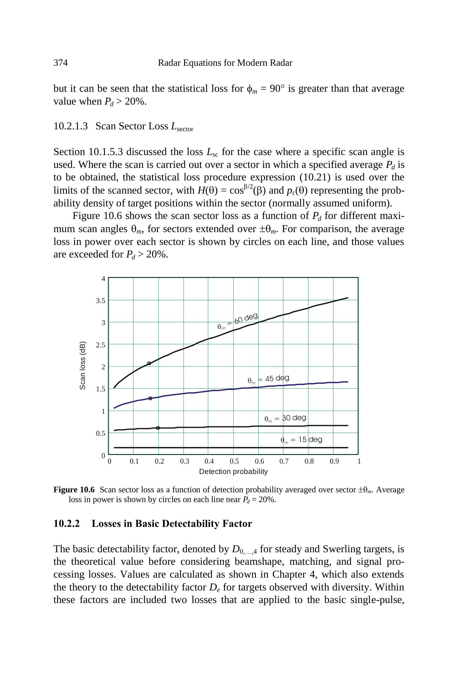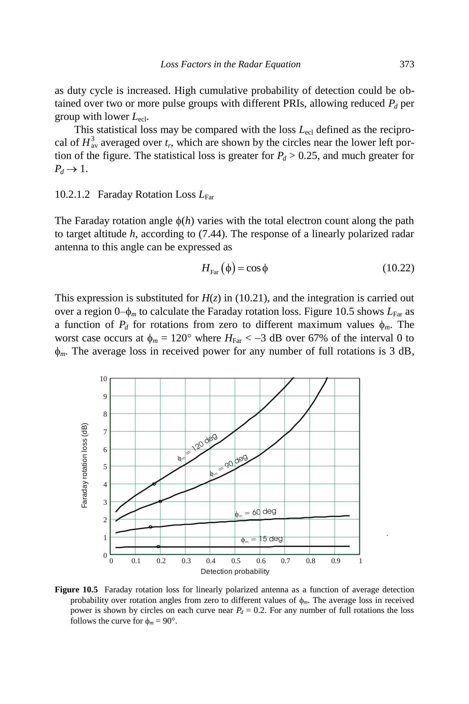 本章列出了在雷达方程中必须以某种形式纳入的损失,以提供准确的性能预测。其中一些在方程中被明确指出,而其他一些则嵌入在其他项中。有些损失在任何操作条件和期望性能下都是常数,而另一些则依赖于环境以及目标相对于雷达(以及电子扫描阵列面方向)的距离和角度位置。还有一些是期望检测概率的函数,当 \(P_{d} \rightarrow 1\) 时会急剧增加。