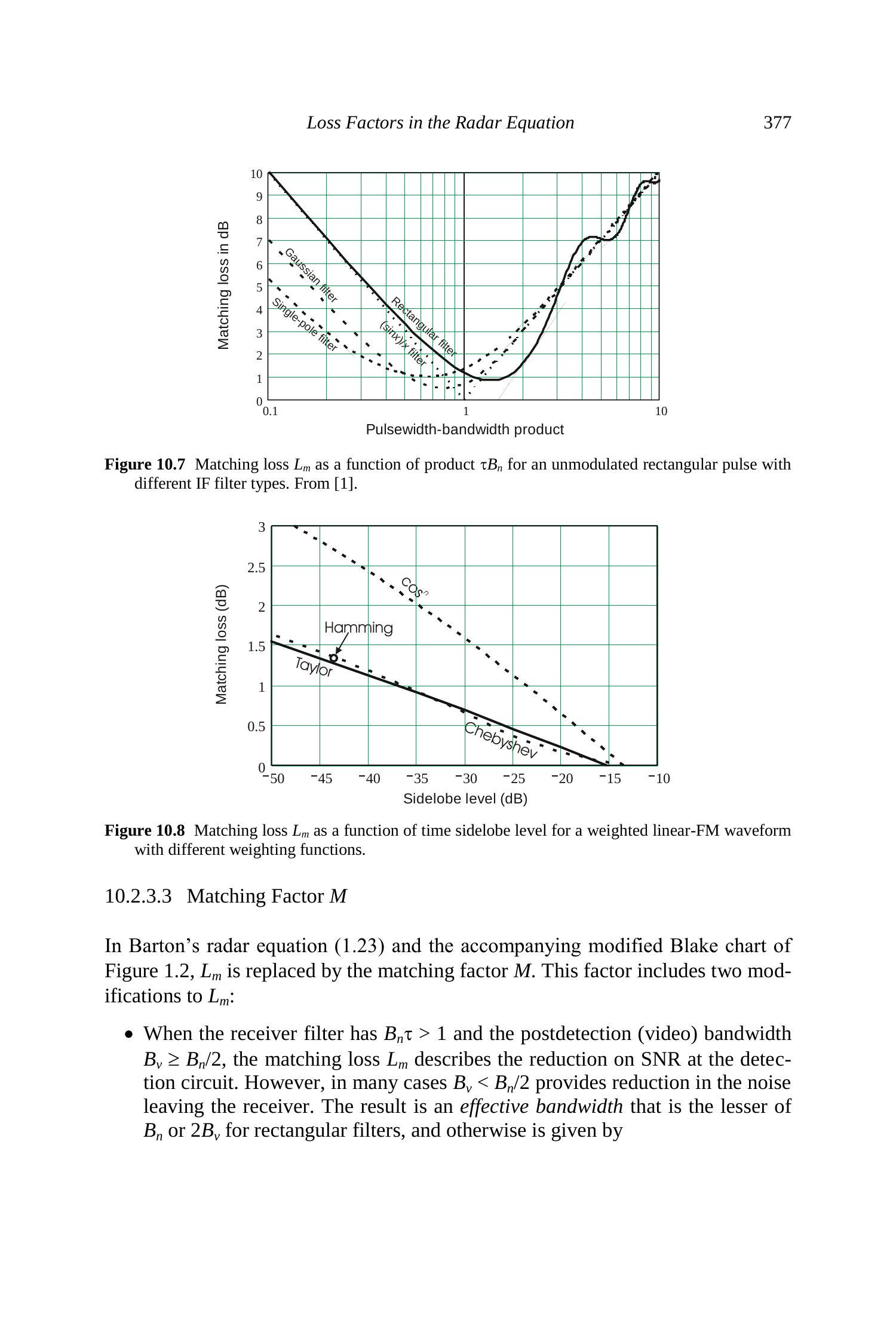 - 多普勒滤波匹配损耗 \(L_{mf}\)。相对于在相干积分时间 \(t_f\) 内接收的脉冲列包络匹配的滤波器的损耗。它取决于在 \(t_f\) 内应用的加权以获得所需滤波器旁瓣水平。对于给定旁瓣水平的滤波器性能,可使用图10.7的曲线,将脉宽因子替换为滤波器带宽因子,并通过效率曲线计算损耗:
