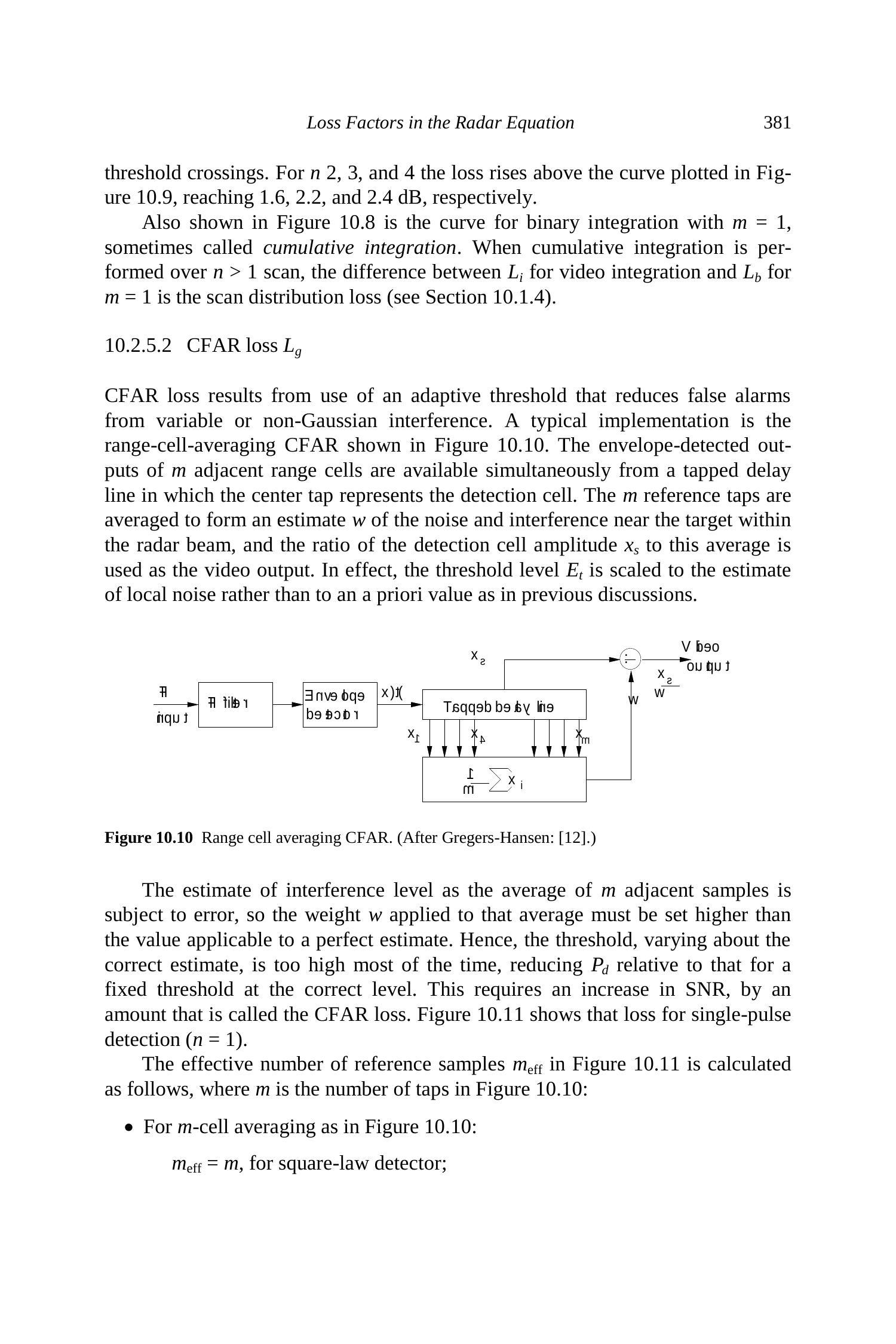 通常使用基于 Rayleigh 分布干扰假设的距离单元平均 CFAR 检测器(图 10.9)。当参考单元数量足够大时,其将归一化到单位噪声功率的阈值功率设定为: