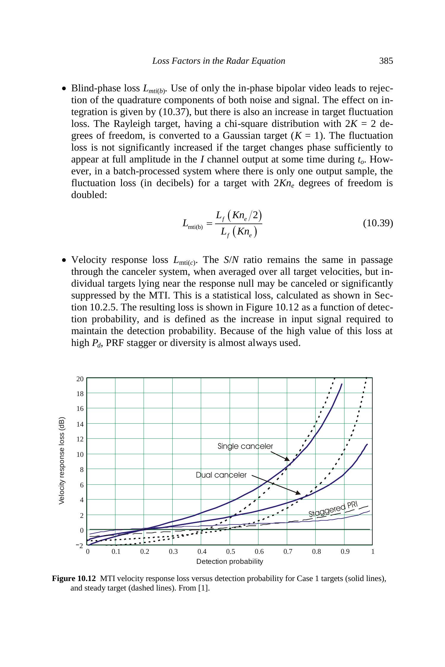 - 盲相损耗 \(L_{\text{mti(b)}}\)。仅使用 I 通道双极视频会丢弃噪声和信号的 Q 分量。积分效应按 (10.37) 计算,同时目标波动损耗增加。瑞利目标(自由度 \(2K=2\))转换为高斯目标(\(K=1\))。若目标在 \(t_0\) 期间相位变化足够以在 I 通道输出中显示全幅,波动损耗增加不显著。但在批处理系统中,若仅有一个输出样本,具有 \(2Kn_e\) 自由度目标的波动损耗(dB)加倍: