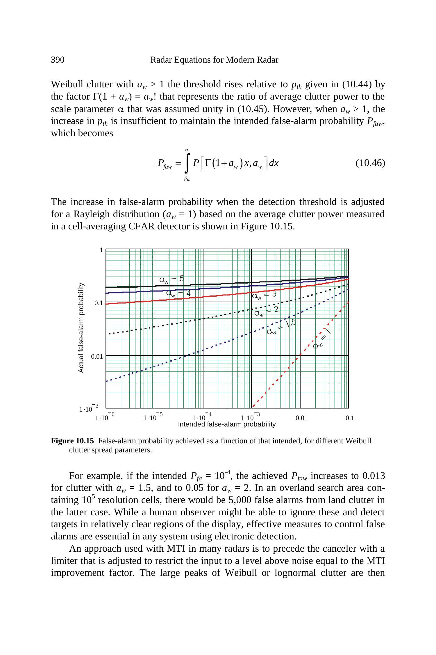 其中 \(x\) 为功率,\(a_{w}\) 为 Weibull 展宽参数,取值范围 \(1 \leq a_{w} \leq 5\)。指数功率分布(Rayleigh 电压)对应 \(a_{w}=1\)。对于 \(a_{w}>1\) 的 Weibull 杂波,相对于 (10.44) 中给出的 \(p_{\text {th}}\),阈值上升了 \(\Gamma\left(1+a_{w}\right)=a_{w}\) 倍,这表示平均杂波功率与假设为 1 的尺度参数 \(\alpha\) 之比。然而,当 \(a_{w}>1\) 时,\(p_{t h}\) 的增加不足以维持预定的误警概率 \(P_{f a w}\),其为: