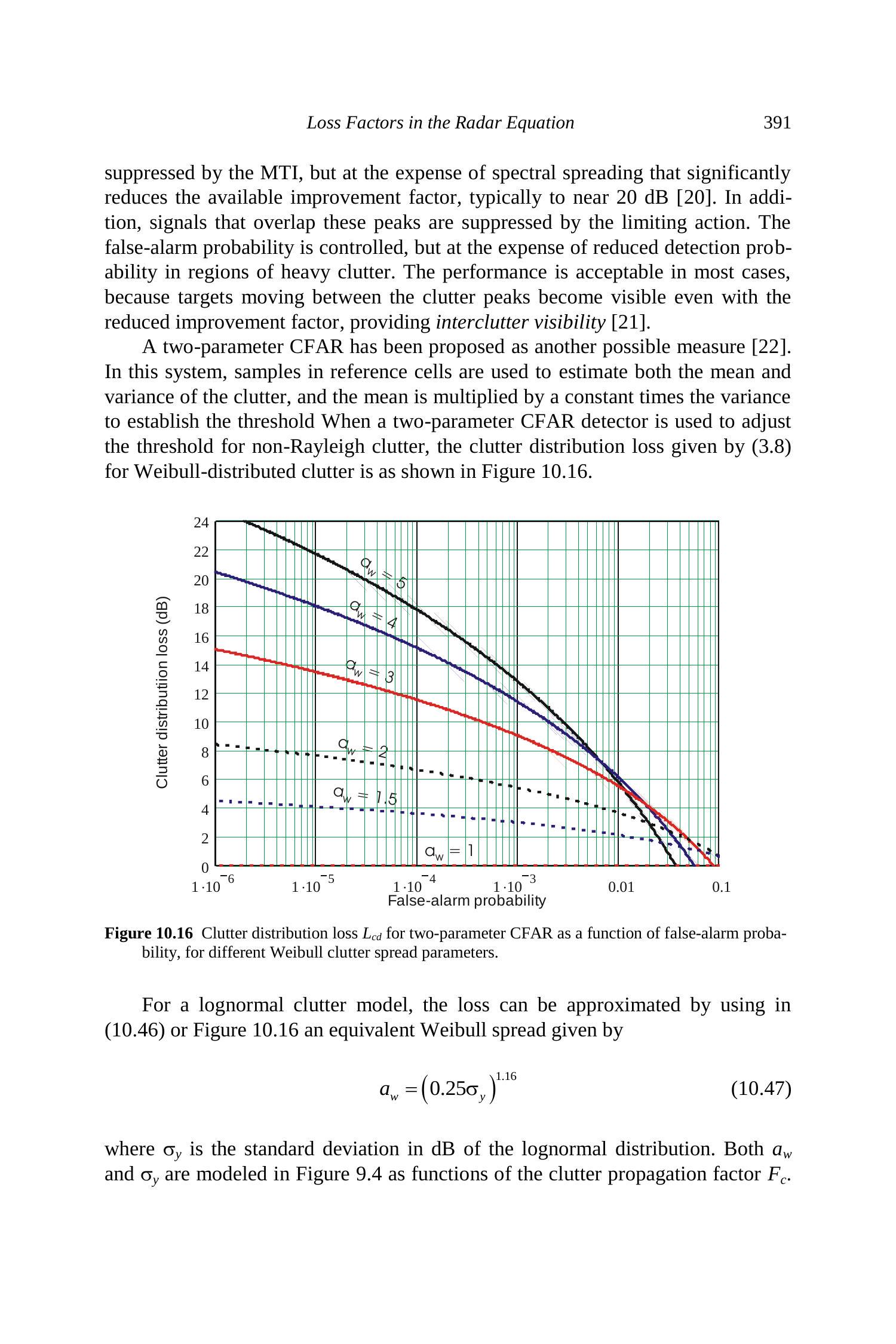 图 10.16 显示了两参数 CFAR 检测器的杂波分布损失。显然,当 \(a_{w}>1\) 时,使用该方法将在相关区域引入较大的损失。