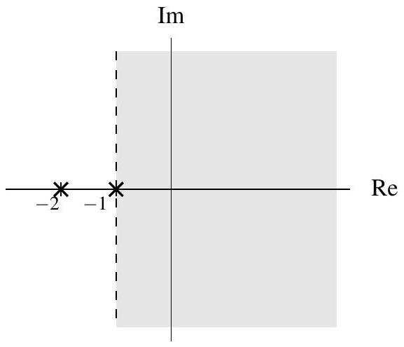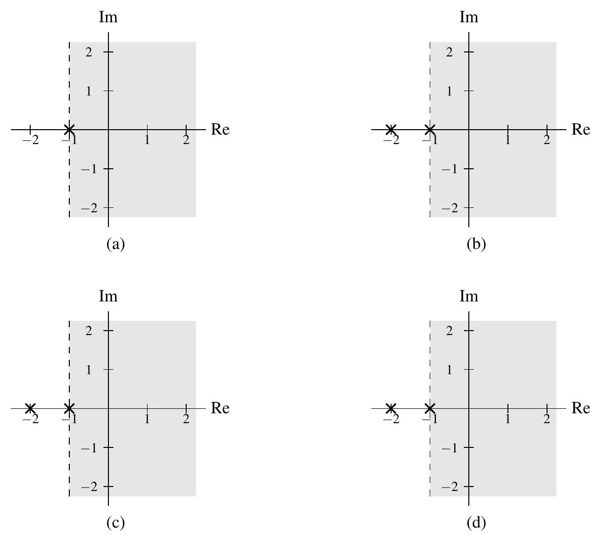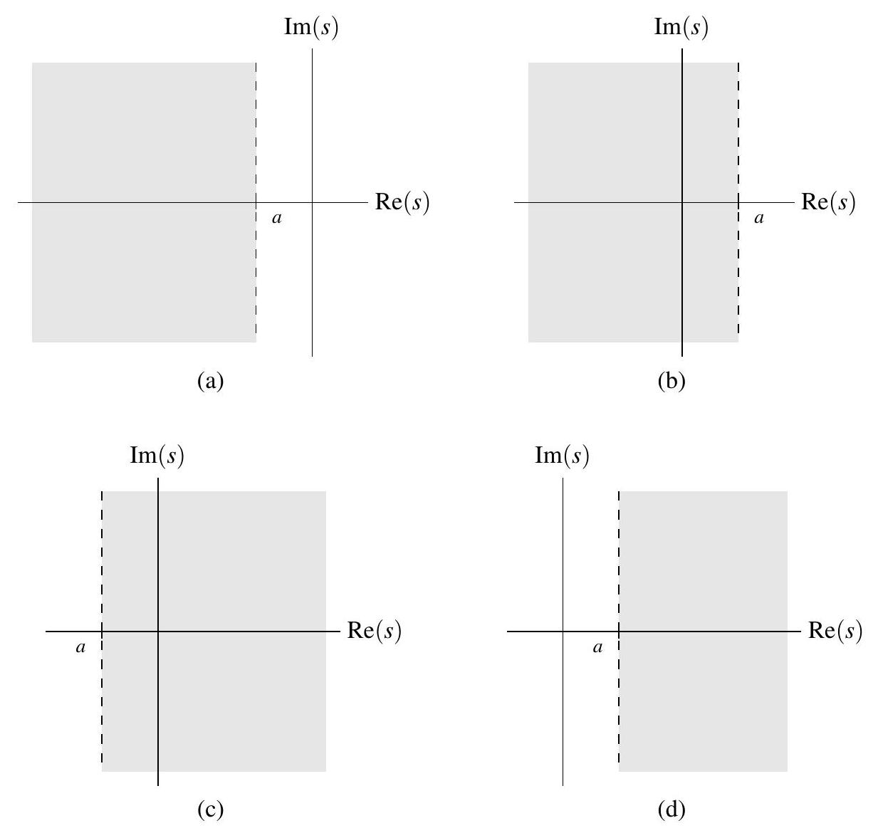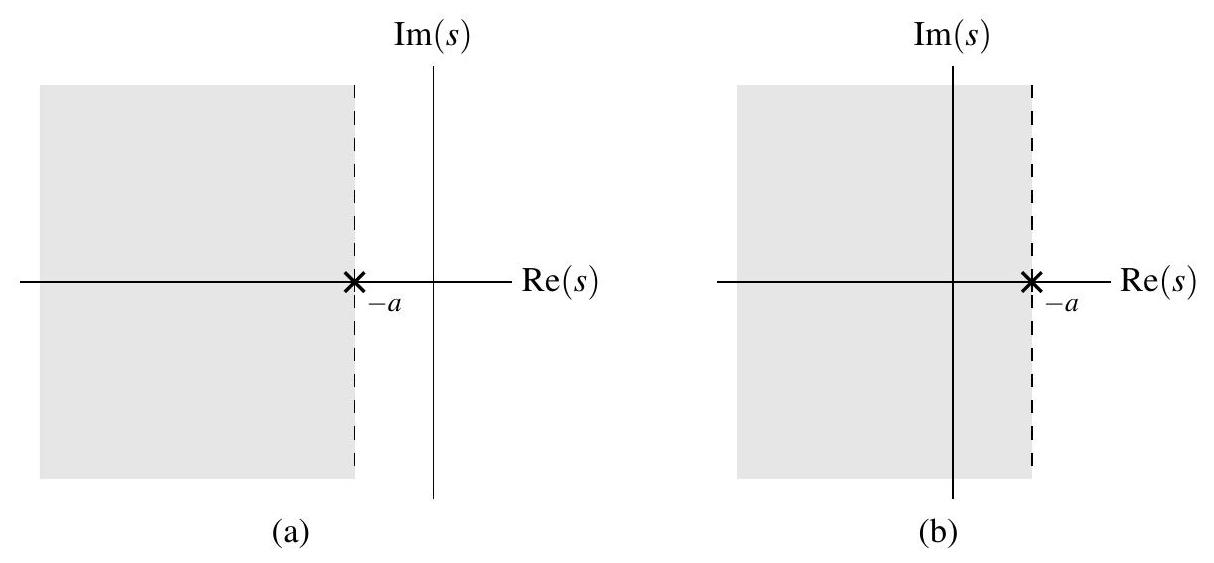 在此,我们比较例 7.3 和例 7.4 的结果,并作出一个重要观察。注意到在这两个例子中,得到的 \(X\) 的代数表达式是相同的(即 \(X(s)=\frac{1}{s+a}\))。唯一的区别在于 \(X\) 的收敛区域。在一个例子中,\(X(s)\) 在 \(\operatorname{Re}(s)>-a\) 时收敛,而在另一个例子中,它在 \(\operatorname{Re}(s)<-a\) 时收敛。事实证明,必须同时给出 \(X\) 的代数表达式及其收敛区域,才能唯一确定 \(x=\mathcal{L}^{-1} X\)。