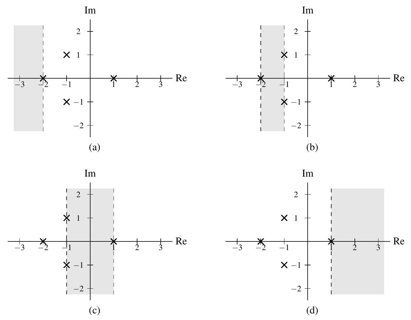 如果函数 \(x\) 是双边序列,并且直线 \(\operatorname{Re}(s)=\sigma_{0}\) 属于其拉普拉斯变换 \(X\) 的ROC,则ROC将在复平面上表现为一个包含该直线的带状区域。图7.13展示了这种情况下可能作为有效或无效ROC的集合示例。