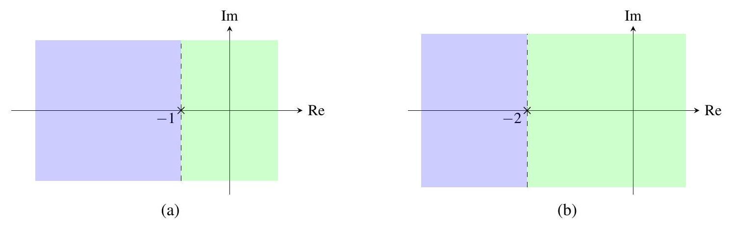 的复数 \(s\)(其中 \(a\) 为实常数),则称 \(R\) 为右半平面(Right-Half Plane, RHP)。图 7.4 给出了 LHP 和 RHP 的示例。