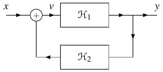 7.112 考虑下图所示 LTI 系统 \(\mathcal{H}\),输入和输出的拉普拉斯变换分别为 \(X\) 和 \(Y\)。图中每个子系统都是 LTI 系统,并标注了其系统函数。求系统 \(\mathcal{H}\) 的系统函数 \(H\),用 \(A, B, C\) 表示。