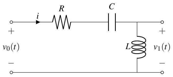 (f) \(\mathcal{D} v_{0}(t)=R C \mathcal{D}^{2} v_{1}(t)+\mathcal{D} v_{1}(t)+\frac{R}{L} v_{1}(t)\);\(H(s)=\frac{L s}{R L C s^{2}+L s+R}\),适用于 \(\operatorname{Re}(s)>\operatorname{Re}\left(\frac{-L+\sqrt{L^{2}-4 R^{2} L C}}{2 R L C}\right)\);BIBO 稳定;带通滤波器,通带中心 \(\pm \frac{1}{\sqrt{L C}}\)。
