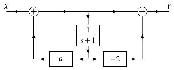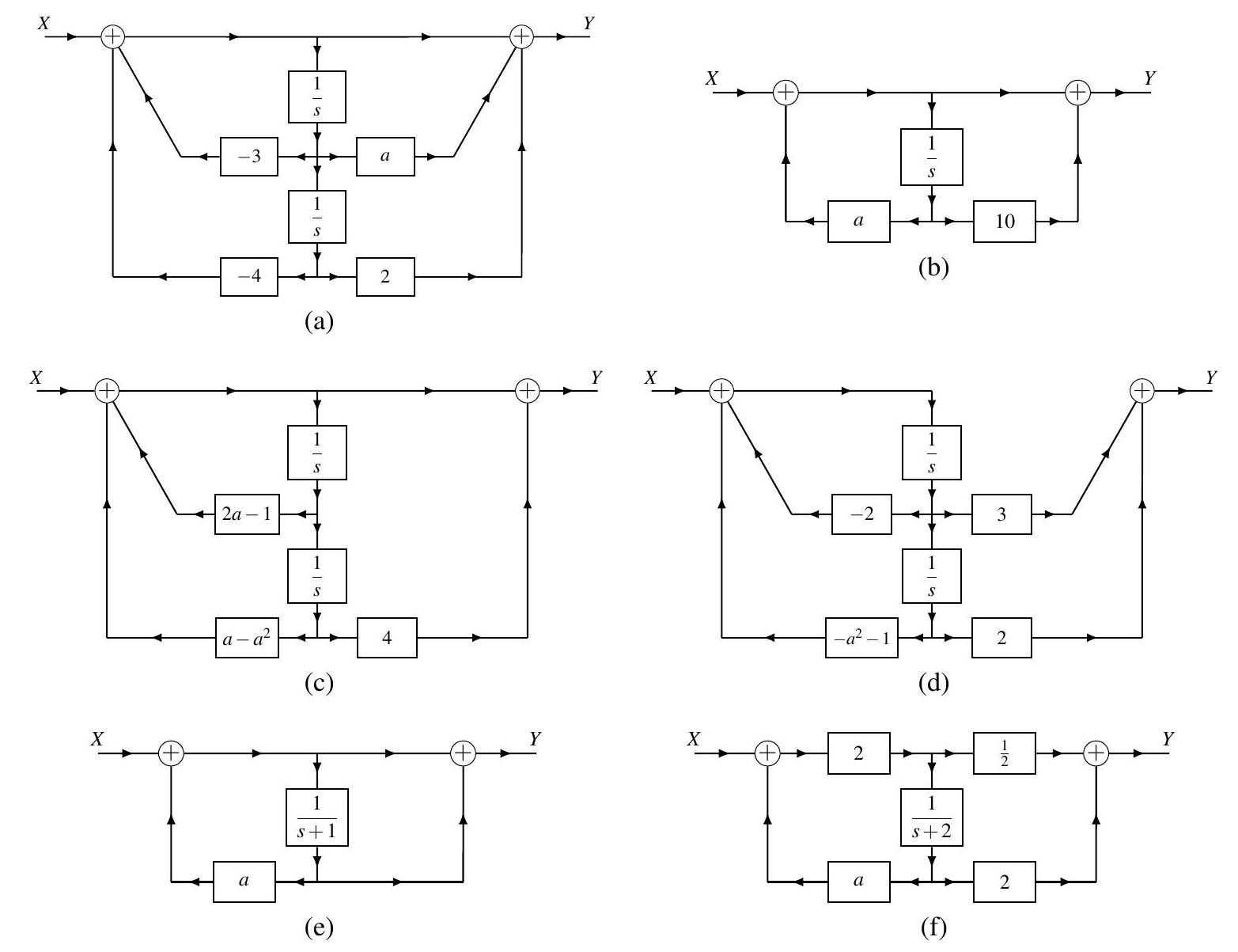 7.116 下列各图显示系统 \(\mathfrak{H}\),输入为 \(X\) 的拉普拉斯变换,输出为 \(Y\) 的拉普拉斯变换。图中每个子系统都是因果 LTI 系统,并标注了系统函数,\(a\) 为实常数。