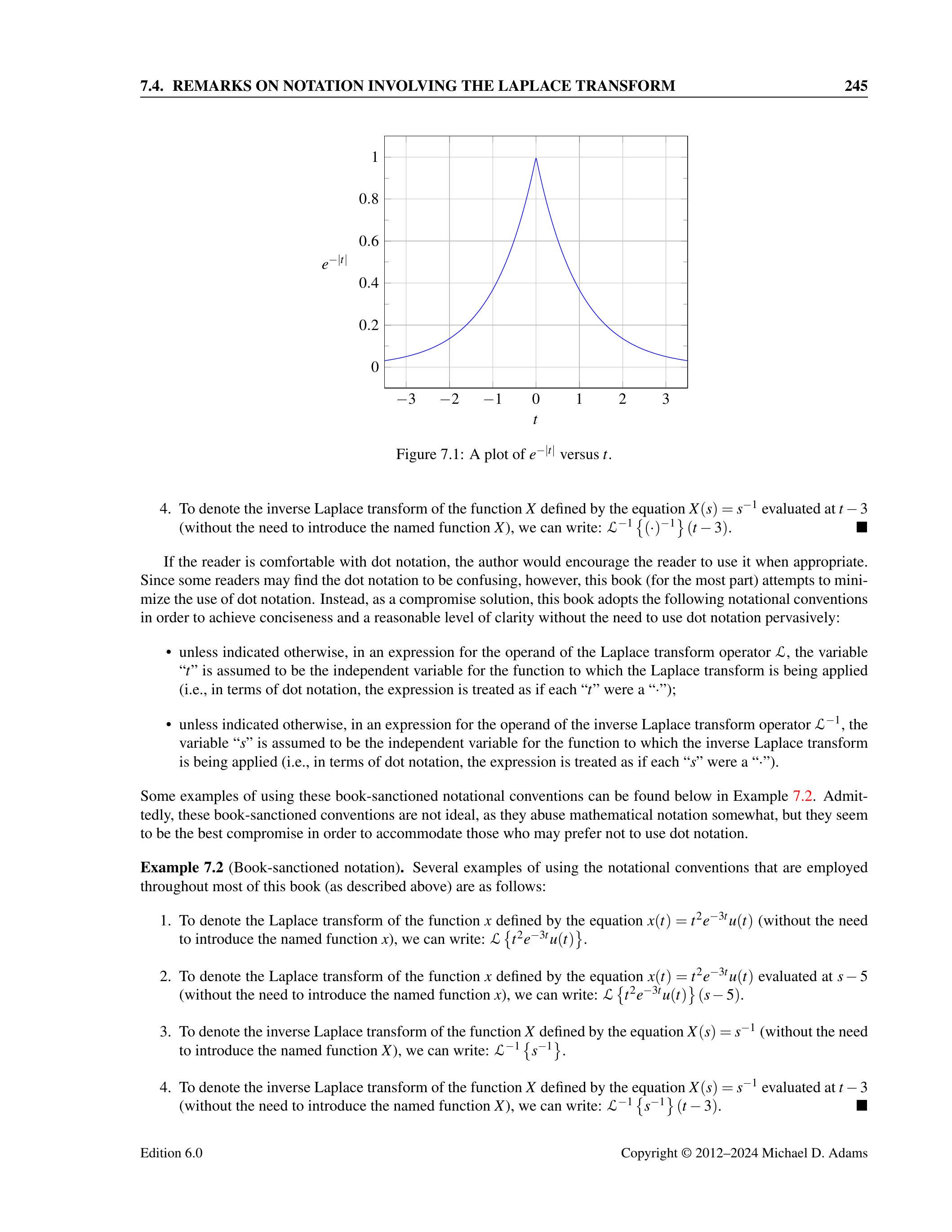 为了避免在引用匿名函数时出现过于冗长的表达,可以使用第 2.1 节介绍的点符号(dot notation)。再考虑图 7.1 中的函数 \(t \mapsto e^{-|t|}\)。若采用严格正确的符号,我们可以写作 “\(\mathcal{L}\left\{e^{-|\cdot|}\right\}\)” 来表示该函数的拉普拉斯变换。换句话说,通过使用间隔点符号(详见第 2.1 节),我们可以明确表示这是一个函数(而不是函数值)。点符号的使用示例如例 7.1 所示。当需要在保持符号精确(严格正确)的同时避免冗长时,点符号往往非常有用。
