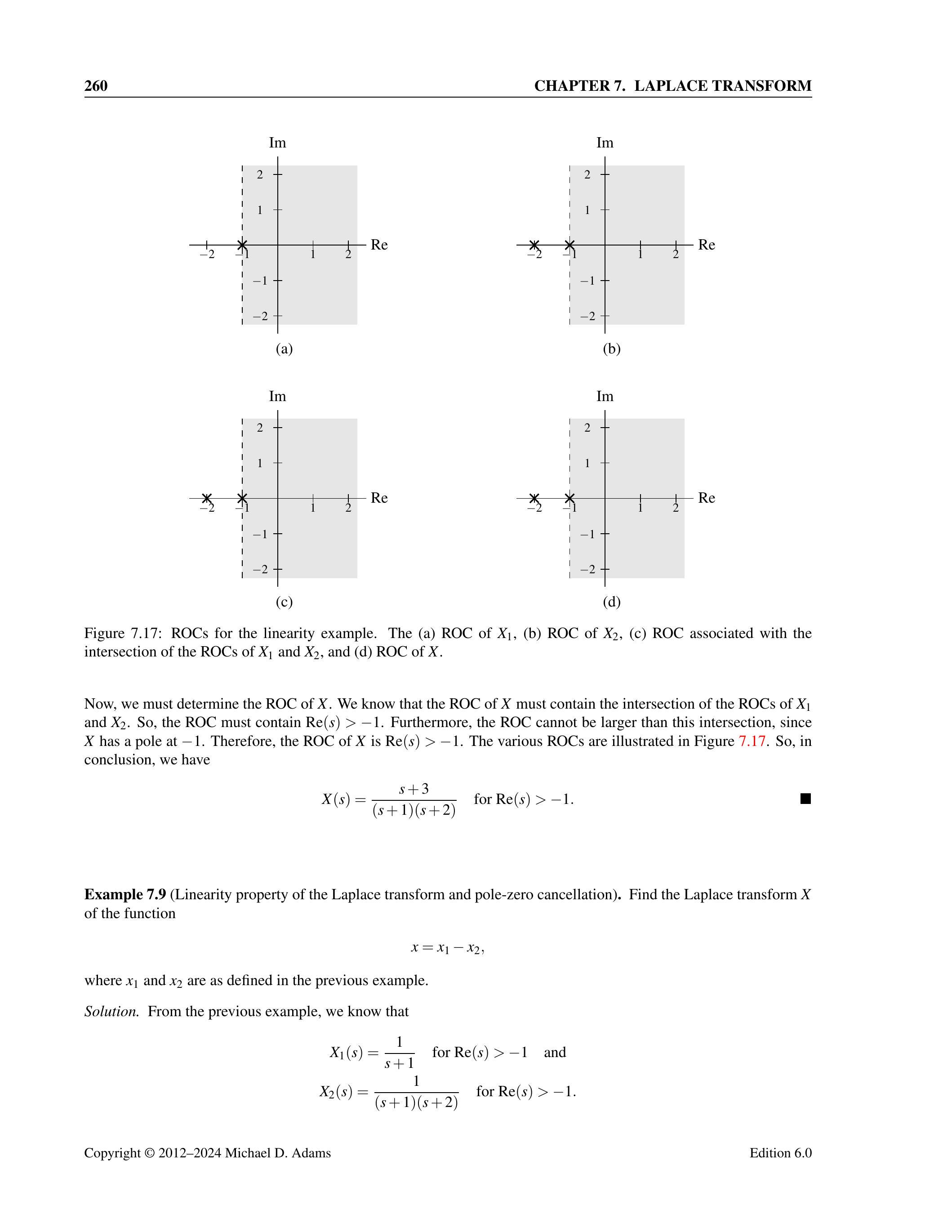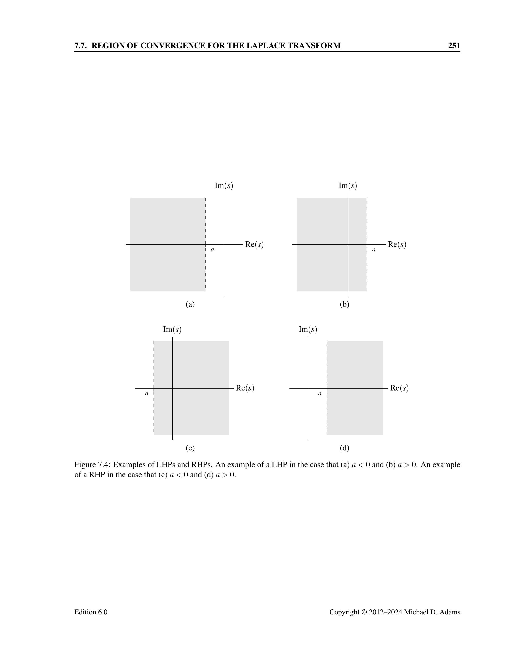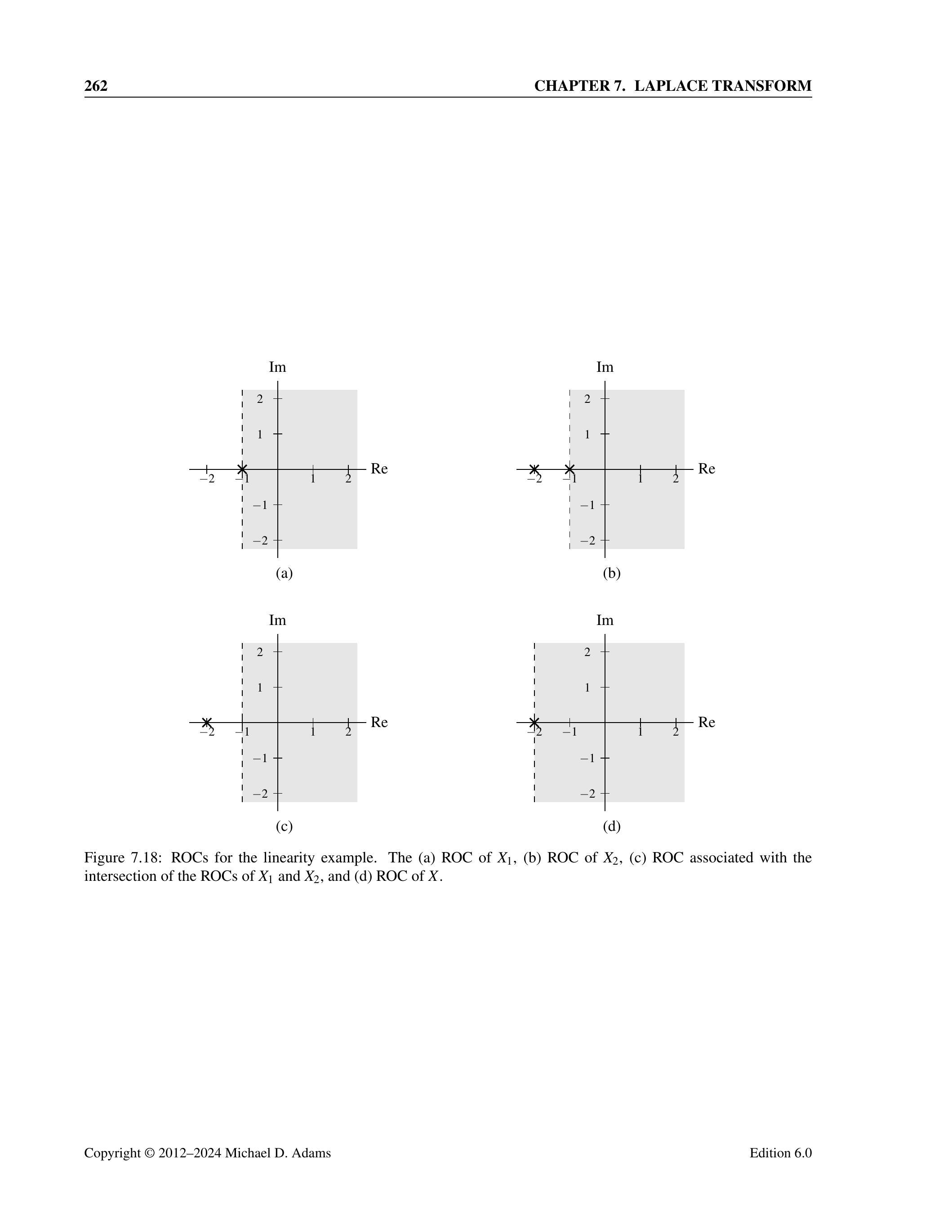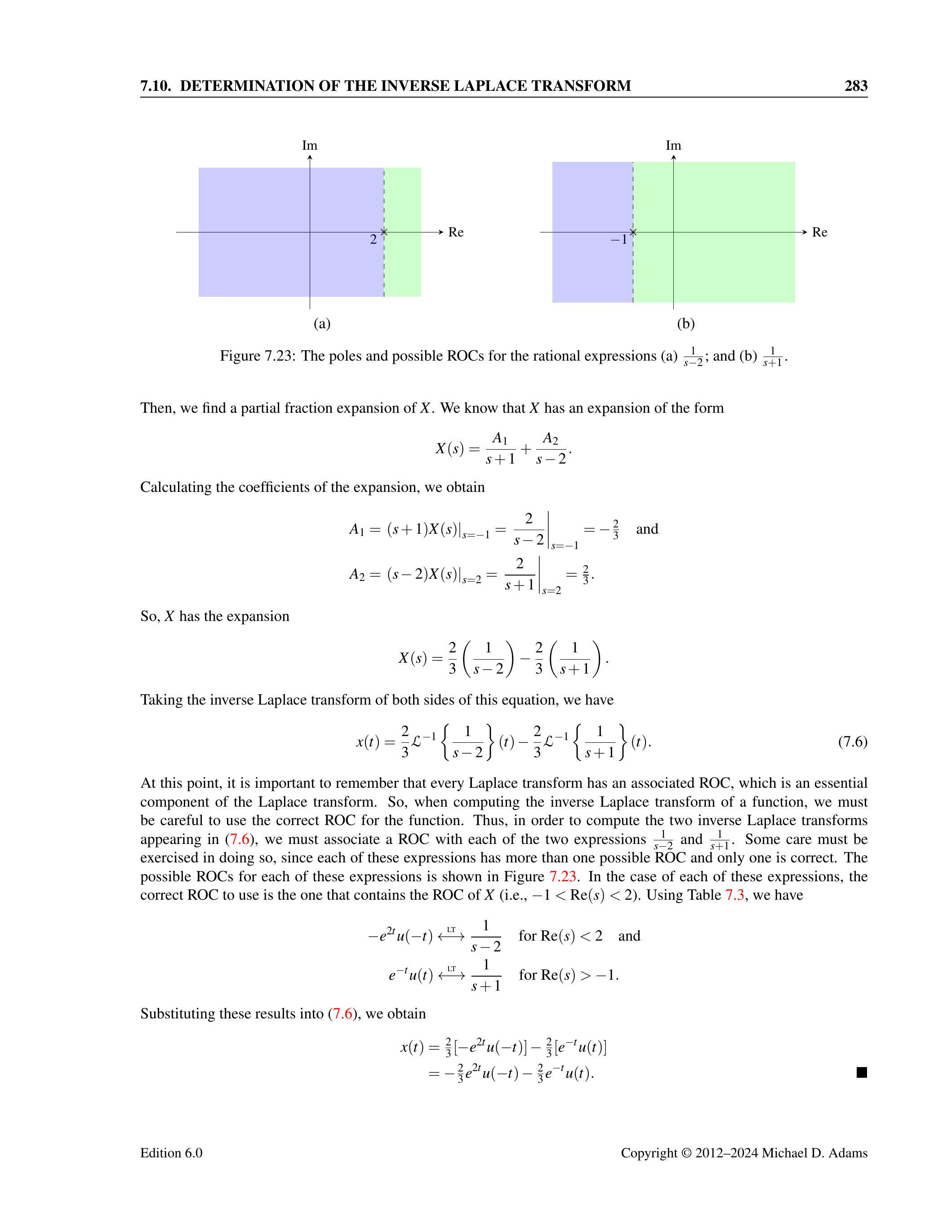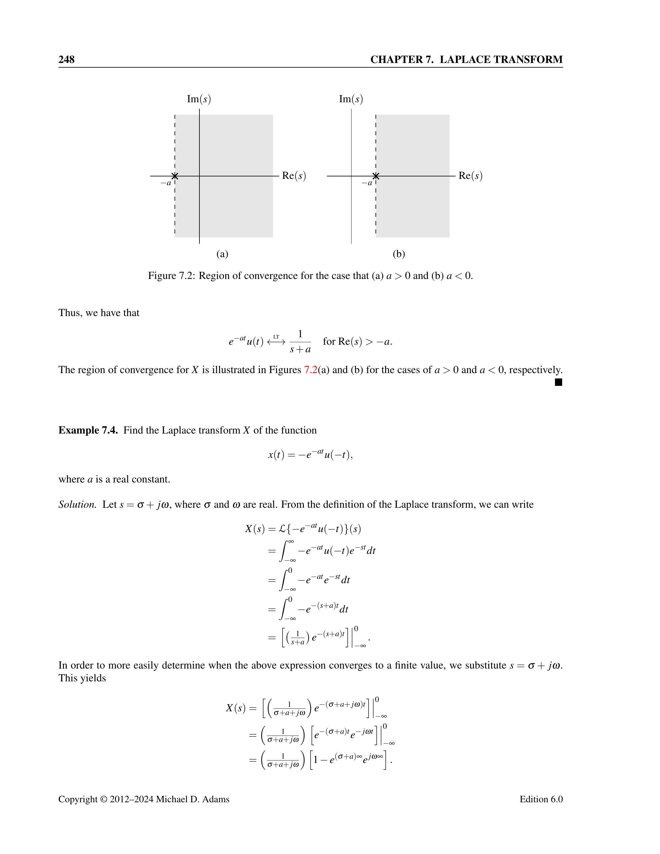 在此,我们比较例 7.3 和例 7.4 的结果,并作出一个重要观察。注意到在这两个例子中,得到的 \(X\) 的代数表达式是相同的(即 \(X(s)=\frac{1}{s+a}\))。唯一的区别在于 \(X\) 的收敛区域。在一个例子中,\(X(s)\) 在 \(\operatorname{Re}(s)>-a\) 时收敛,而在另一个例子中,它在 \(\operatorname{Re}(s)<-a\) 时收敛。事实证明,必须同时给出 \(X\) 的代数表达式及其收敛区域,才能唯一确定 \(x=\mathcal{L}^{-1} X\)。