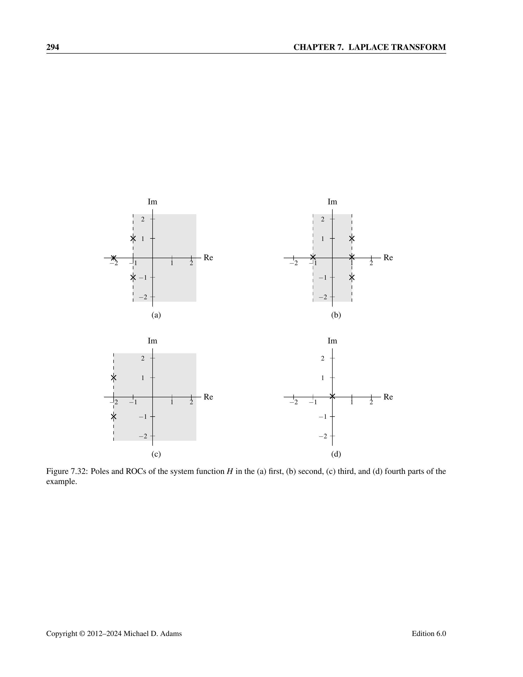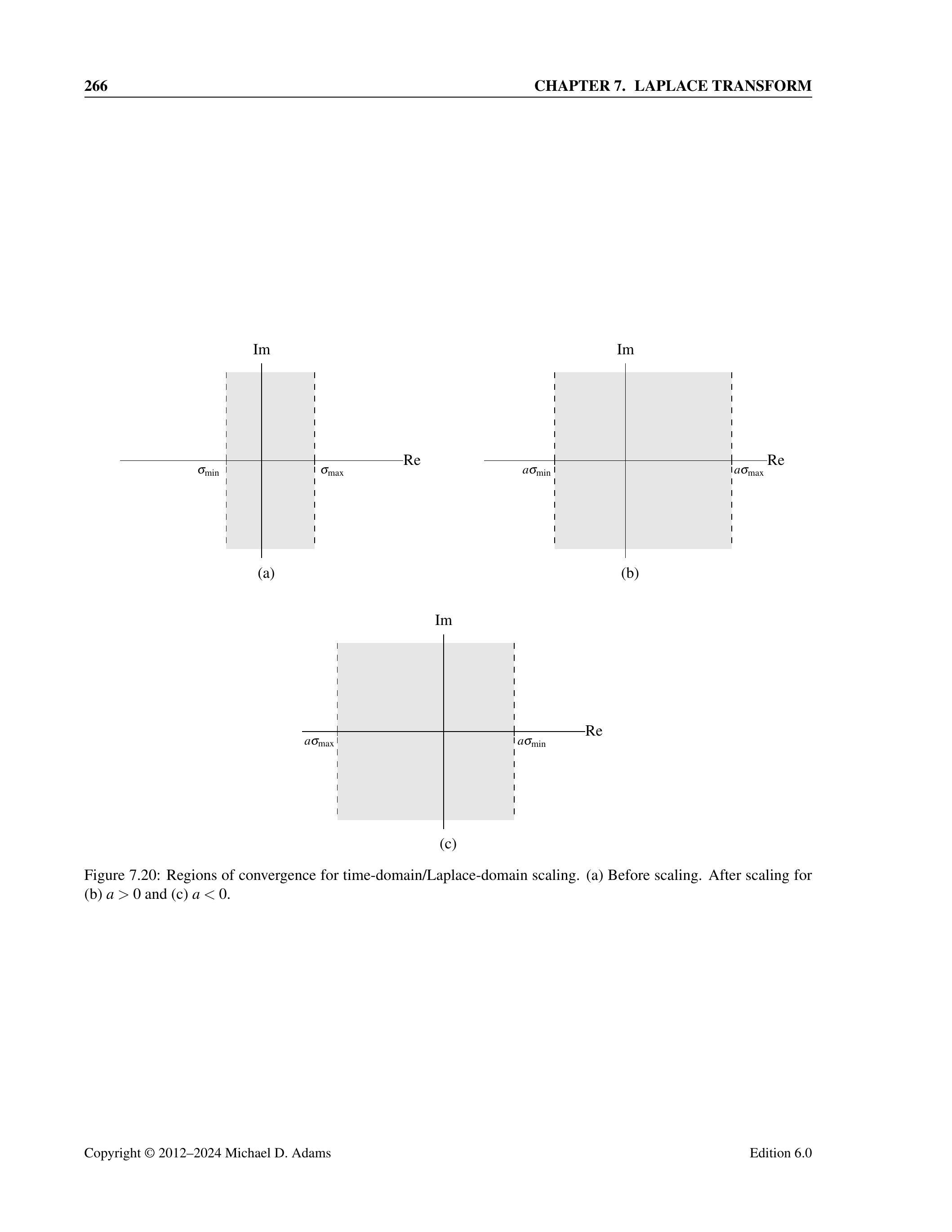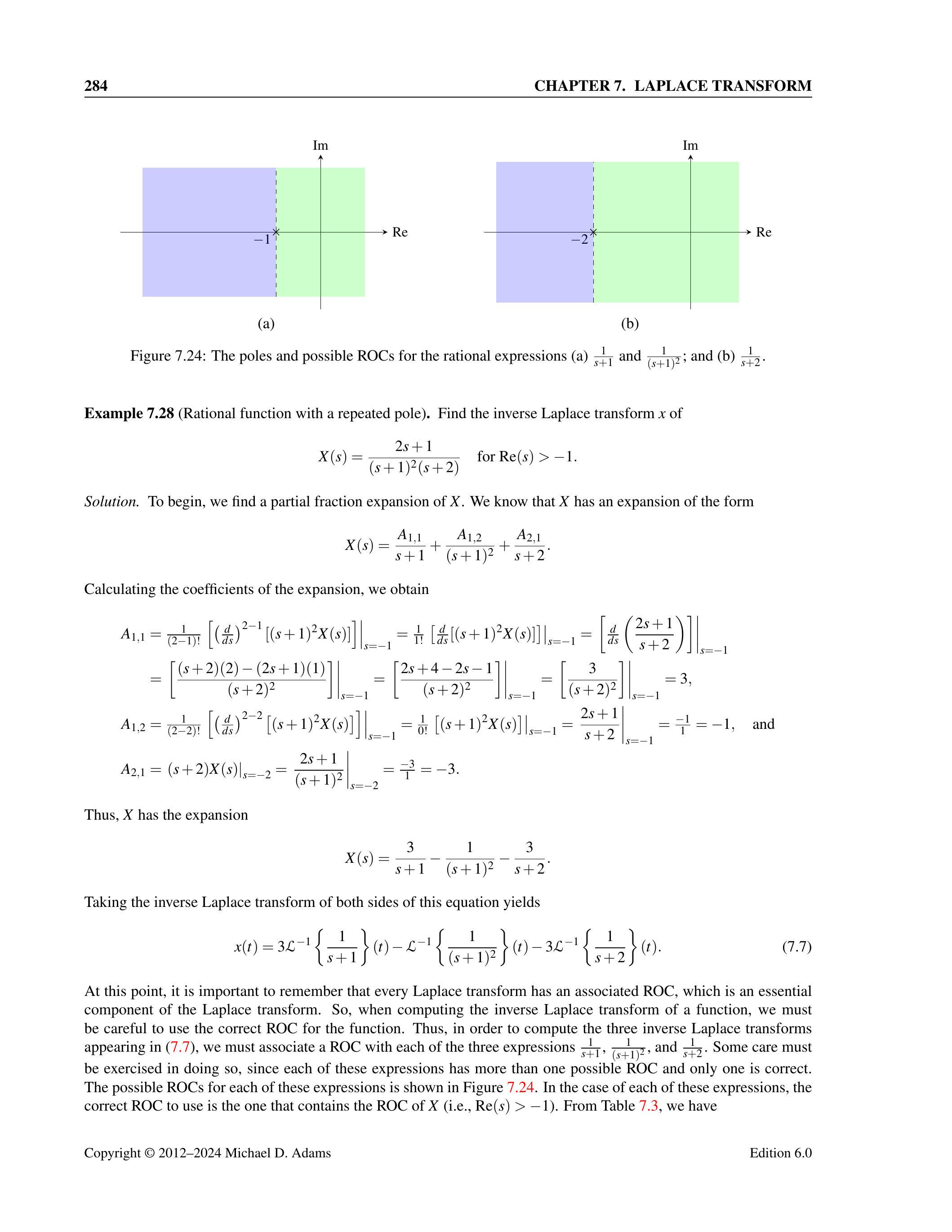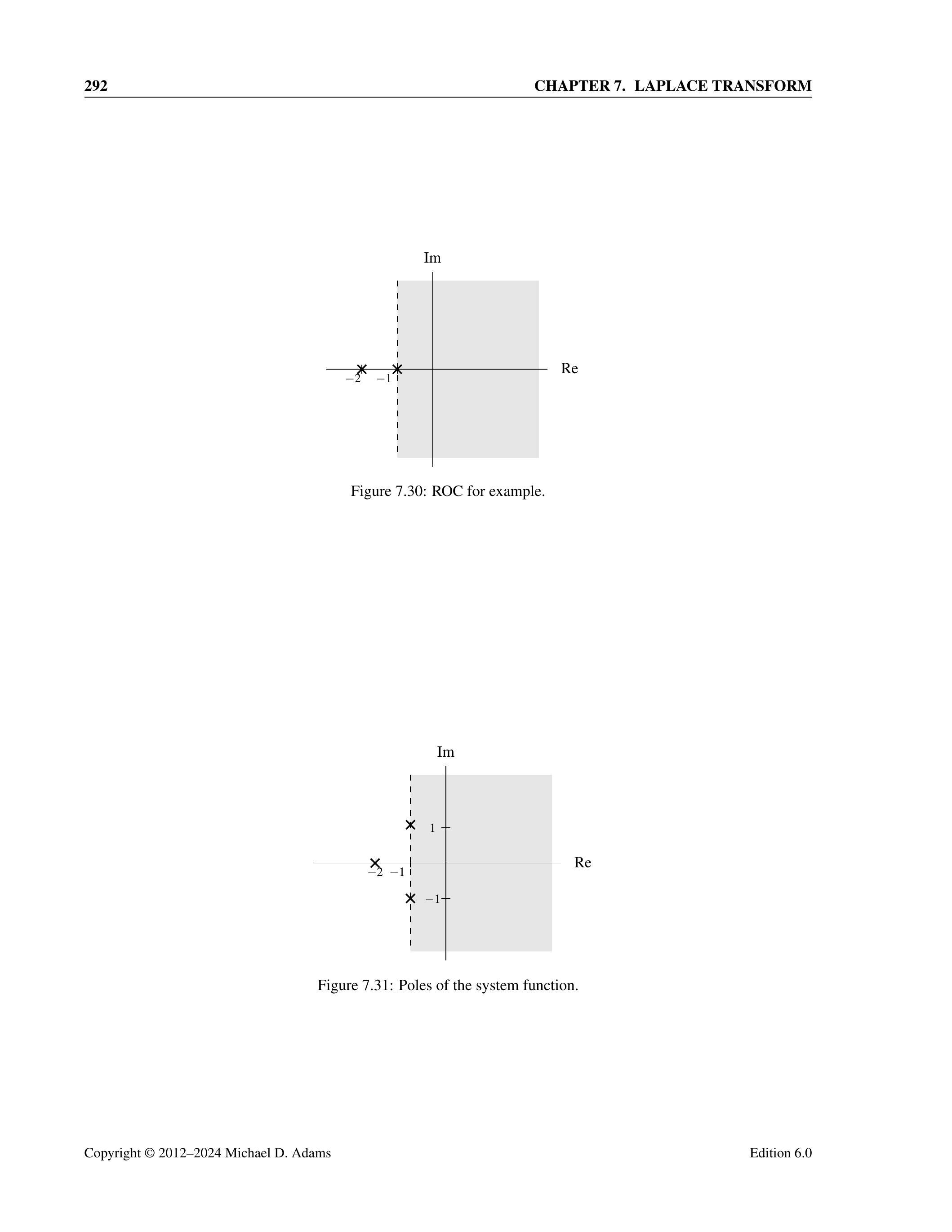 在此,我们比较例 7.3 和例 7.4 的结果,并作出一个重要观察。注意到在这两个例子中,得到的 \(X\) 的代数表达式是相同的(即 \(X(s)=\frac{1}{s+a}\))。唯一的区别在于 \(X\) 的收敛区域。在一个例子中,\(X(s)\) 在 \(\operatorname{Re}(s)>-a\) 时收敛,而在另一个例子中,它在 \(\operatorname{Re}(s)<-a\) 时收敛。事实证明,必须同时给出 \(X\) 的代数表达式及其收敛区域,才能唯一确定 \(x=\mathcal{L}^{-1} X\)。
