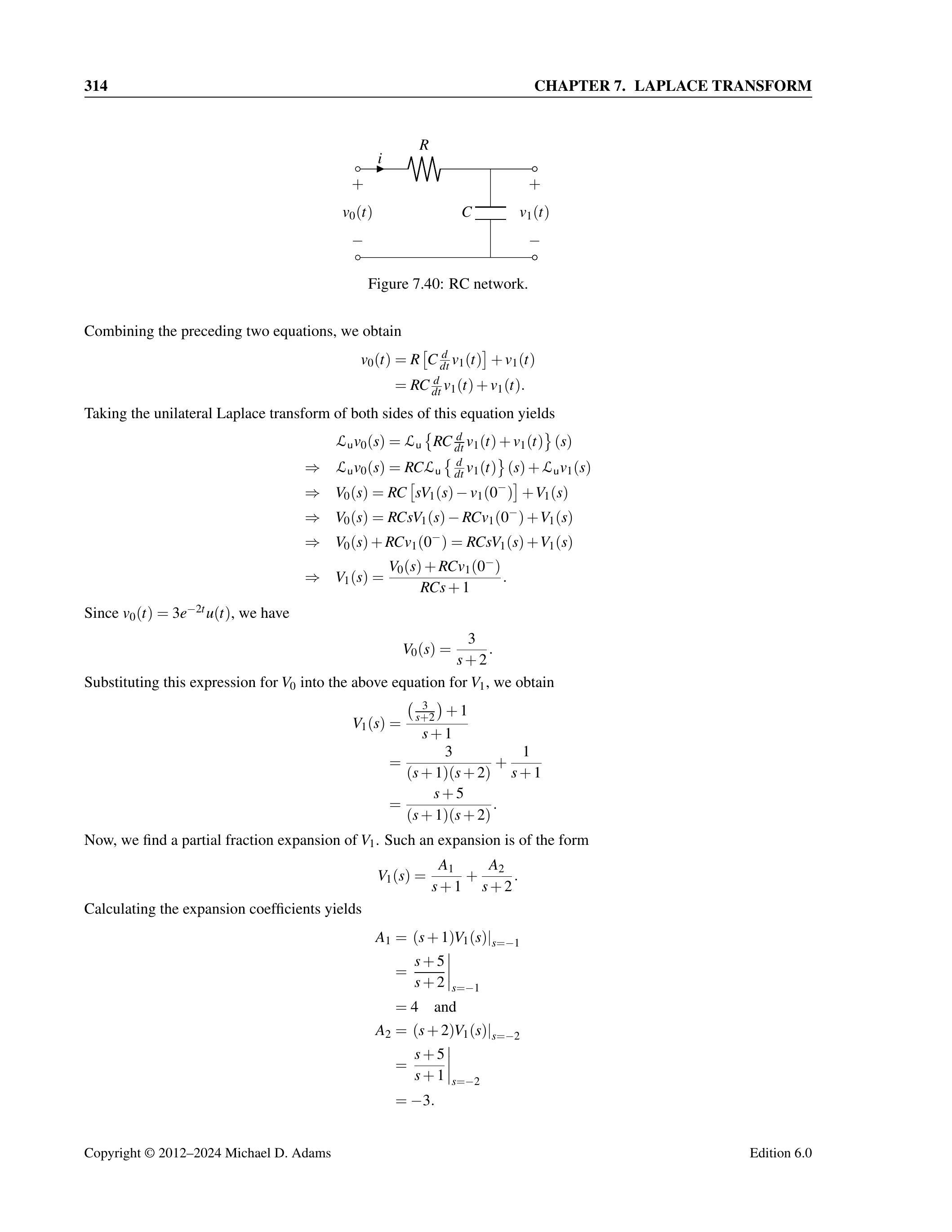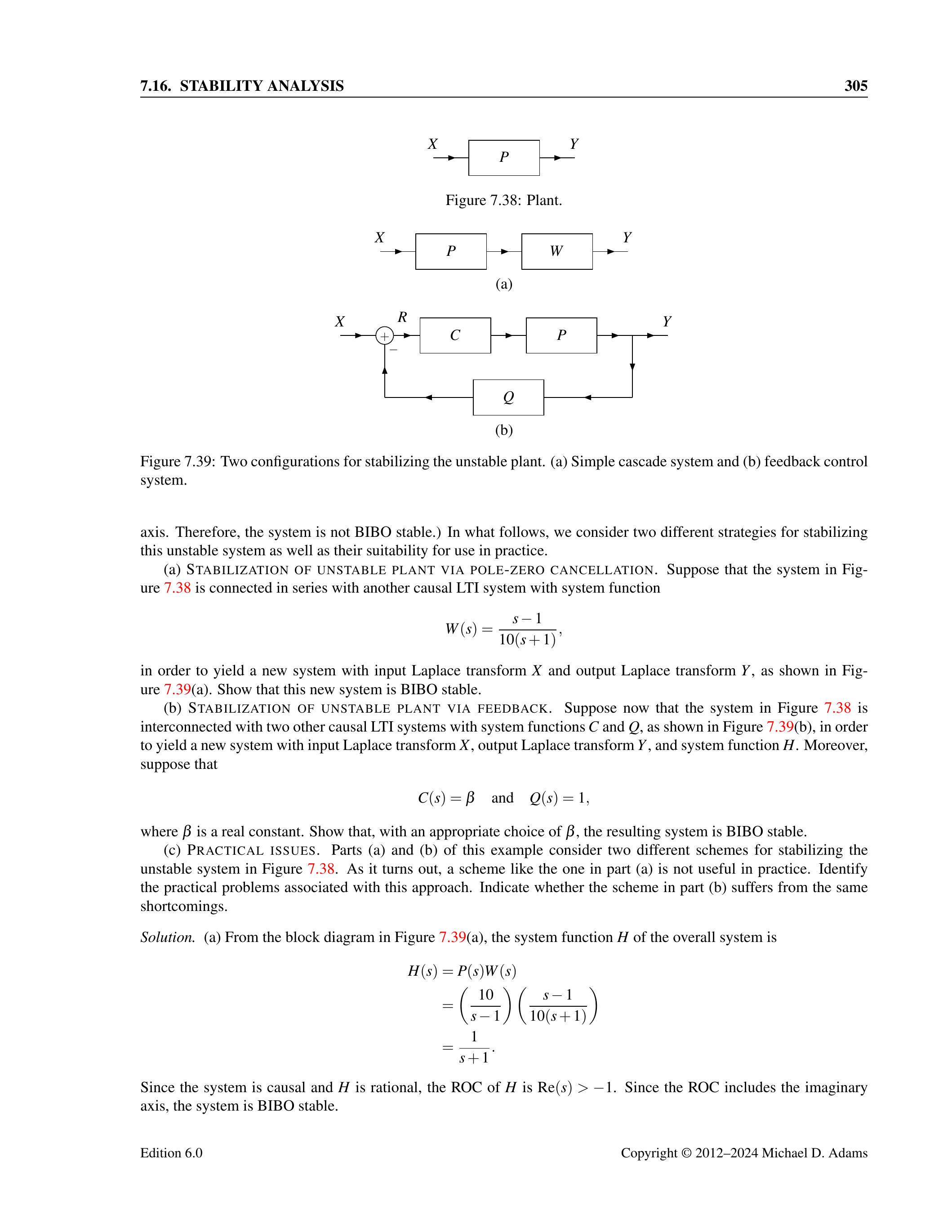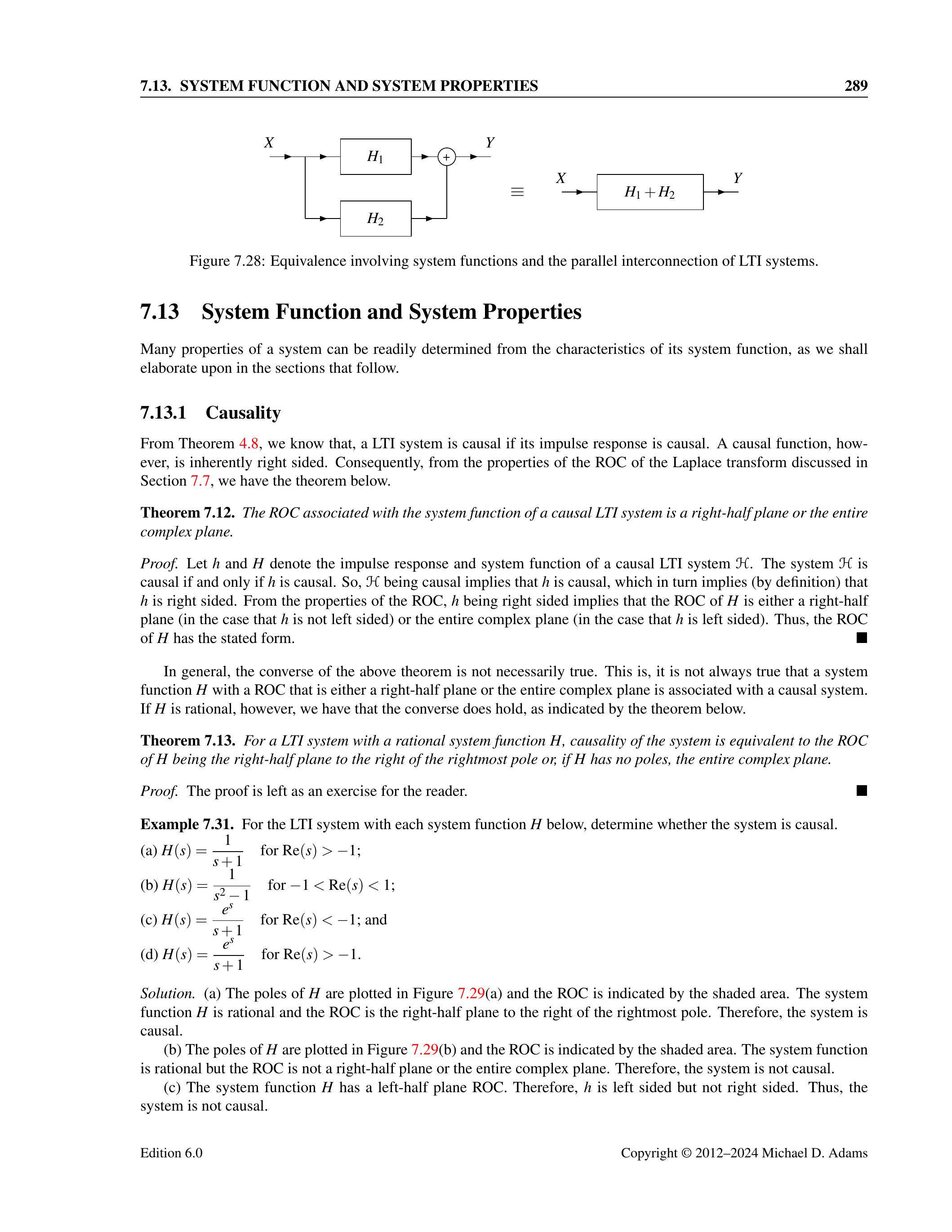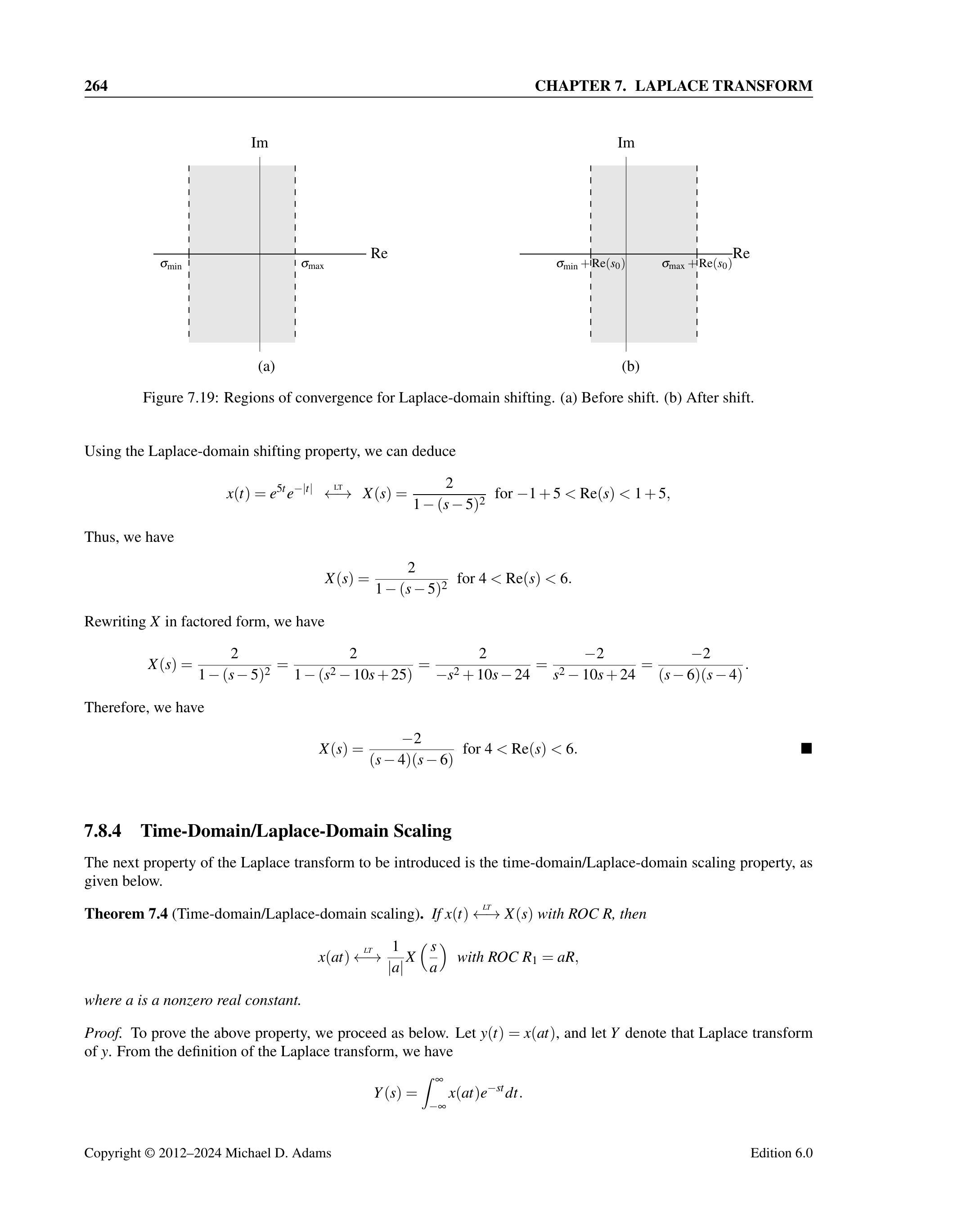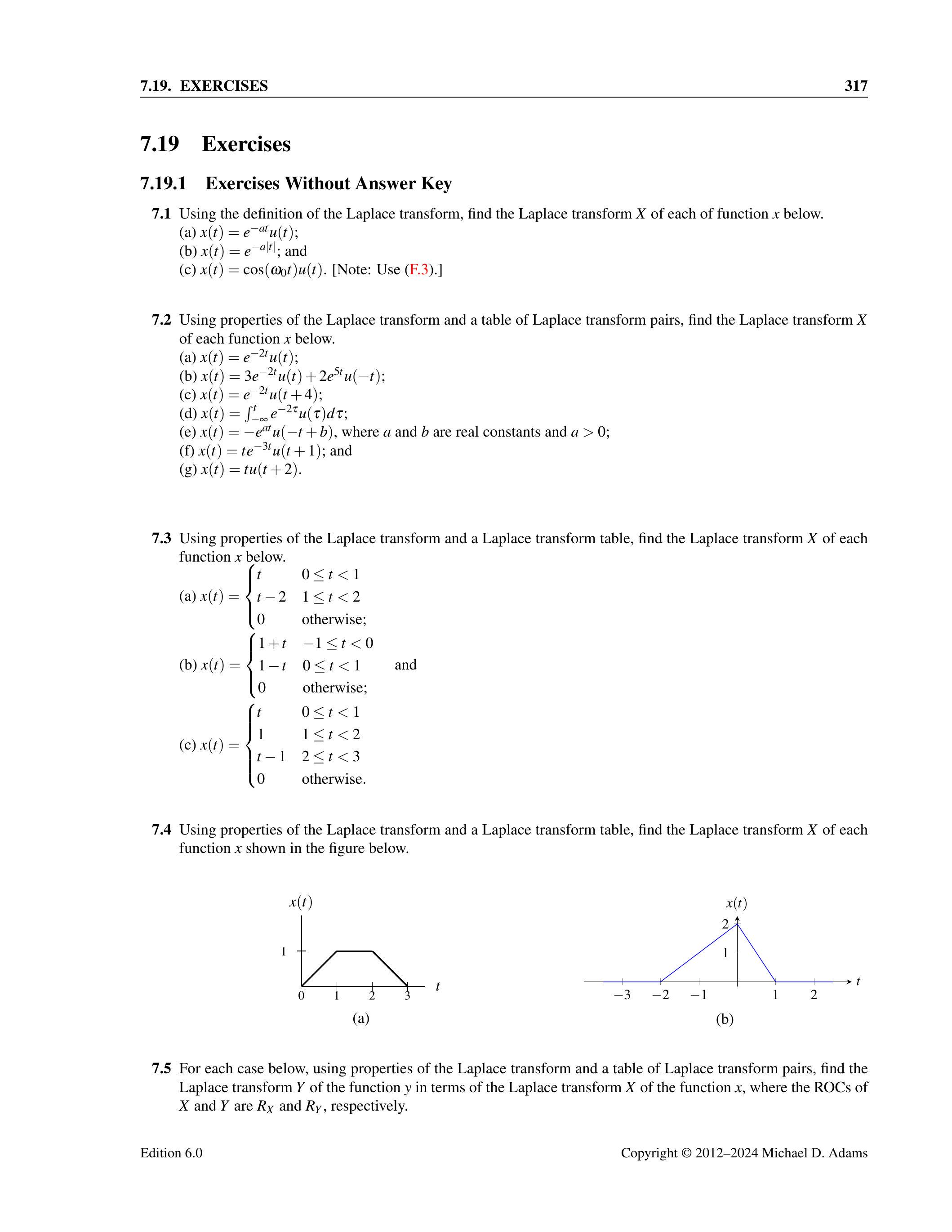 在此,我们比较例 7.3 和例 7.4 的结果,并作出一个重要观察。注意到在这两个例子中,得到的 \(X\) 的代数表达式是相同的(即 \(X(s)=\frac{1}{s+a}\))。唯一的区别在于 \(X\) 的收敛区域。在一个例子中,\(X(s)\) 在 \(\operatorname{Re}(s)>-a\) 时收敛,而在另一个例子中,它在 \(\operatorname{Re}(s)<-a\) 时收敛。事实证明,必须同时给出 \(X\) 的代数表达式及其收敛区域,才能唯一确定 \(x=\mathcal{L}^{-1} X\)。