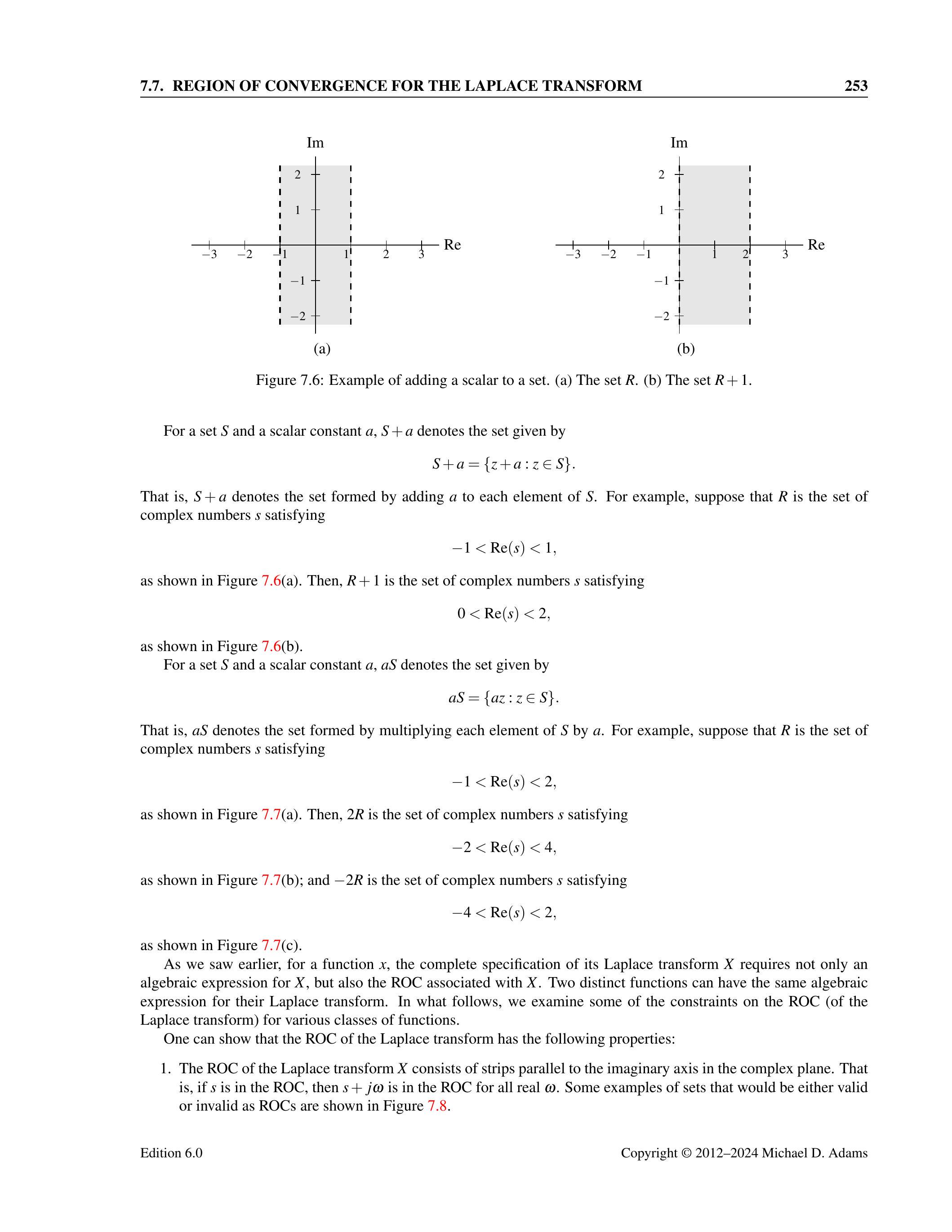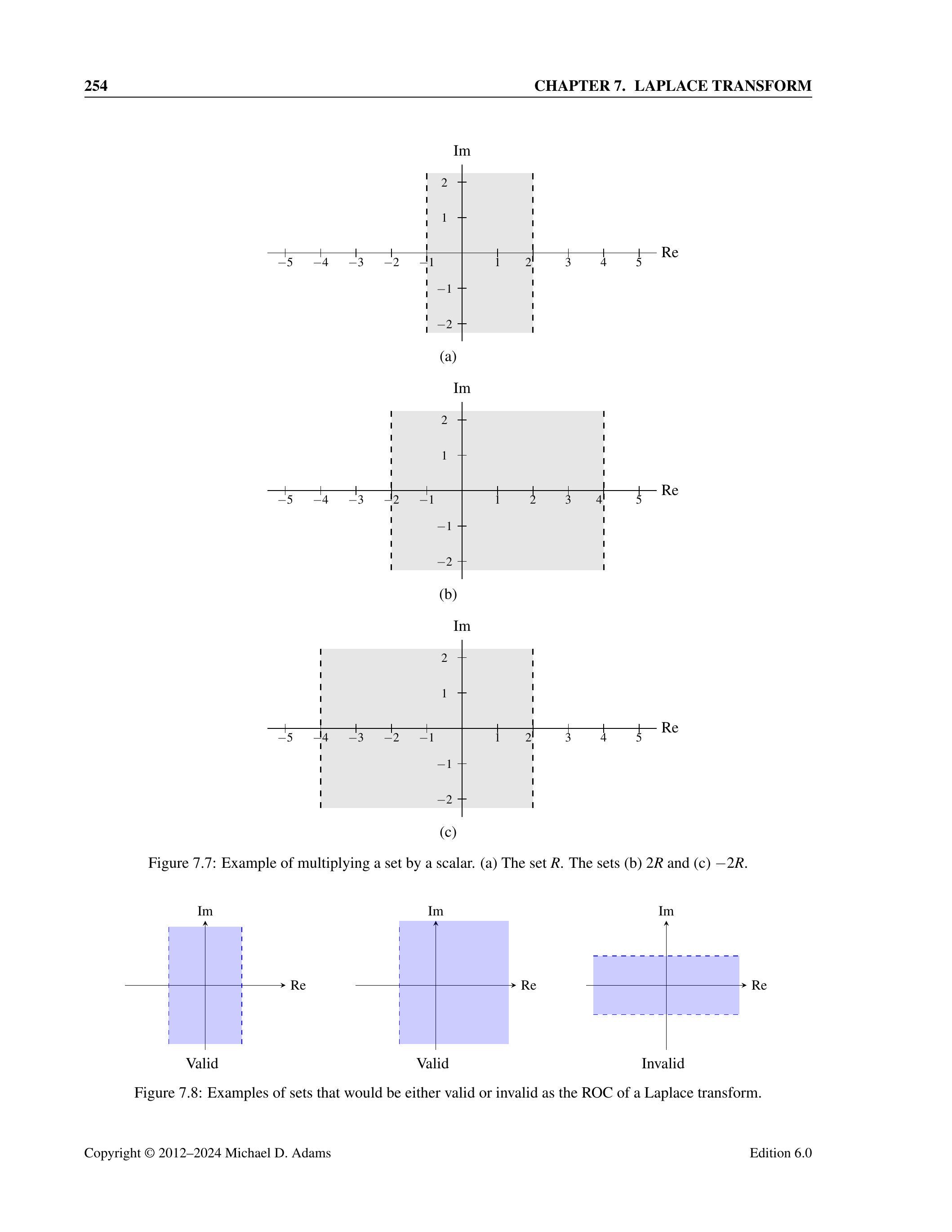 - 拉普拉斯变换 \(X\) 的ROC由复平面上与虚轴平行的带状区域组成。也就是说,如果 \(s\) 在ROC内,那么 \(s+j \omega\) 对所有实数 \(\omega\) 也在ROC内。图7.8展示了一些可能作为有效或无效ROC的集合示例。