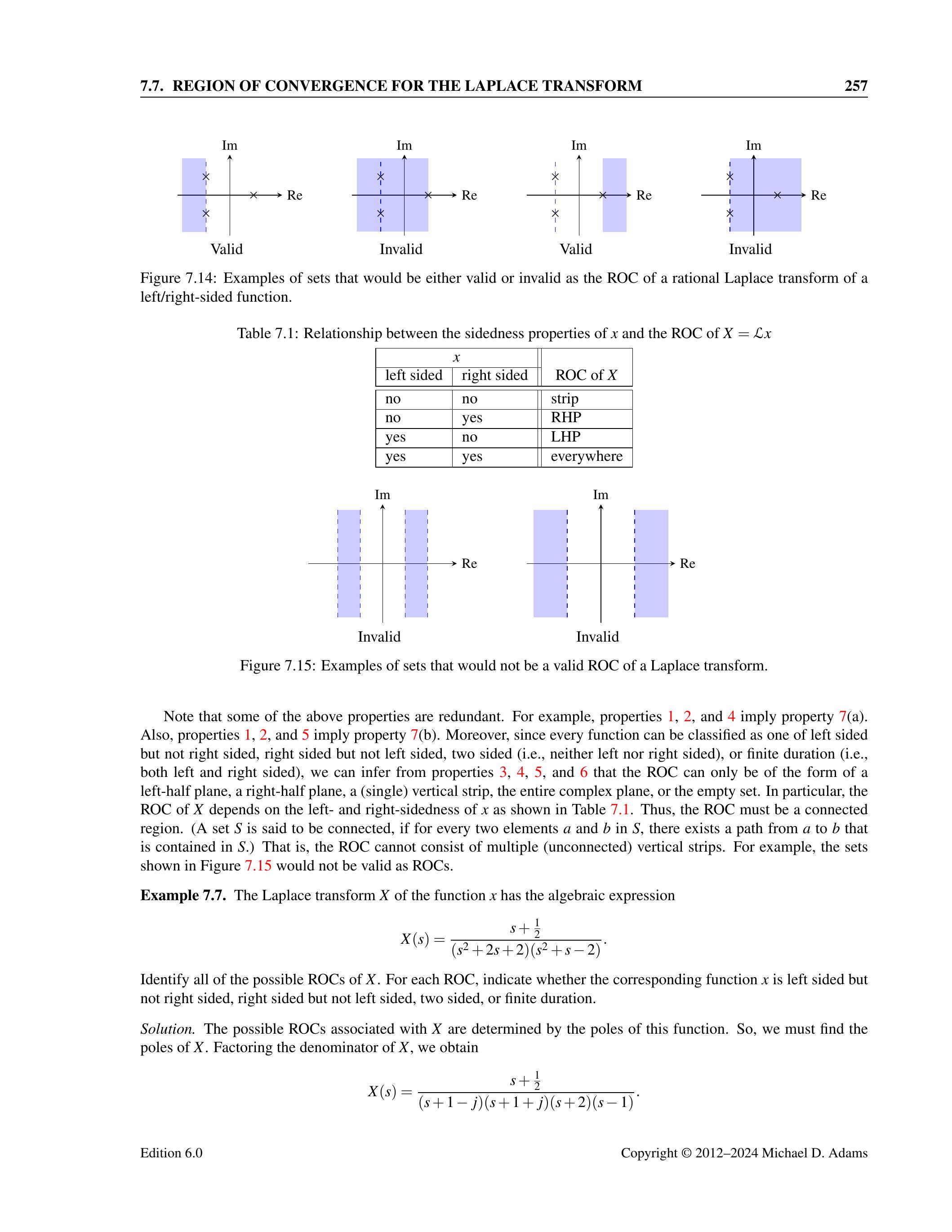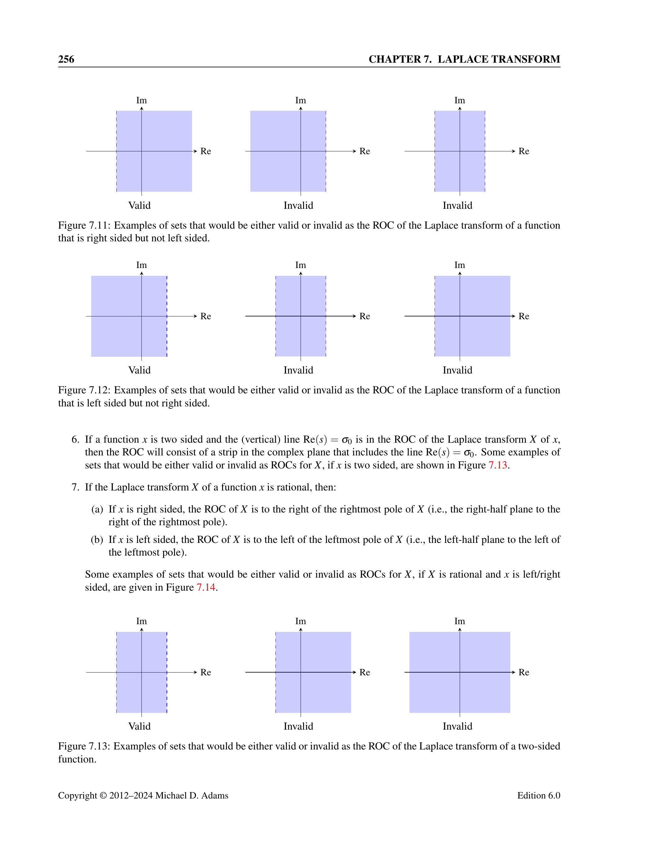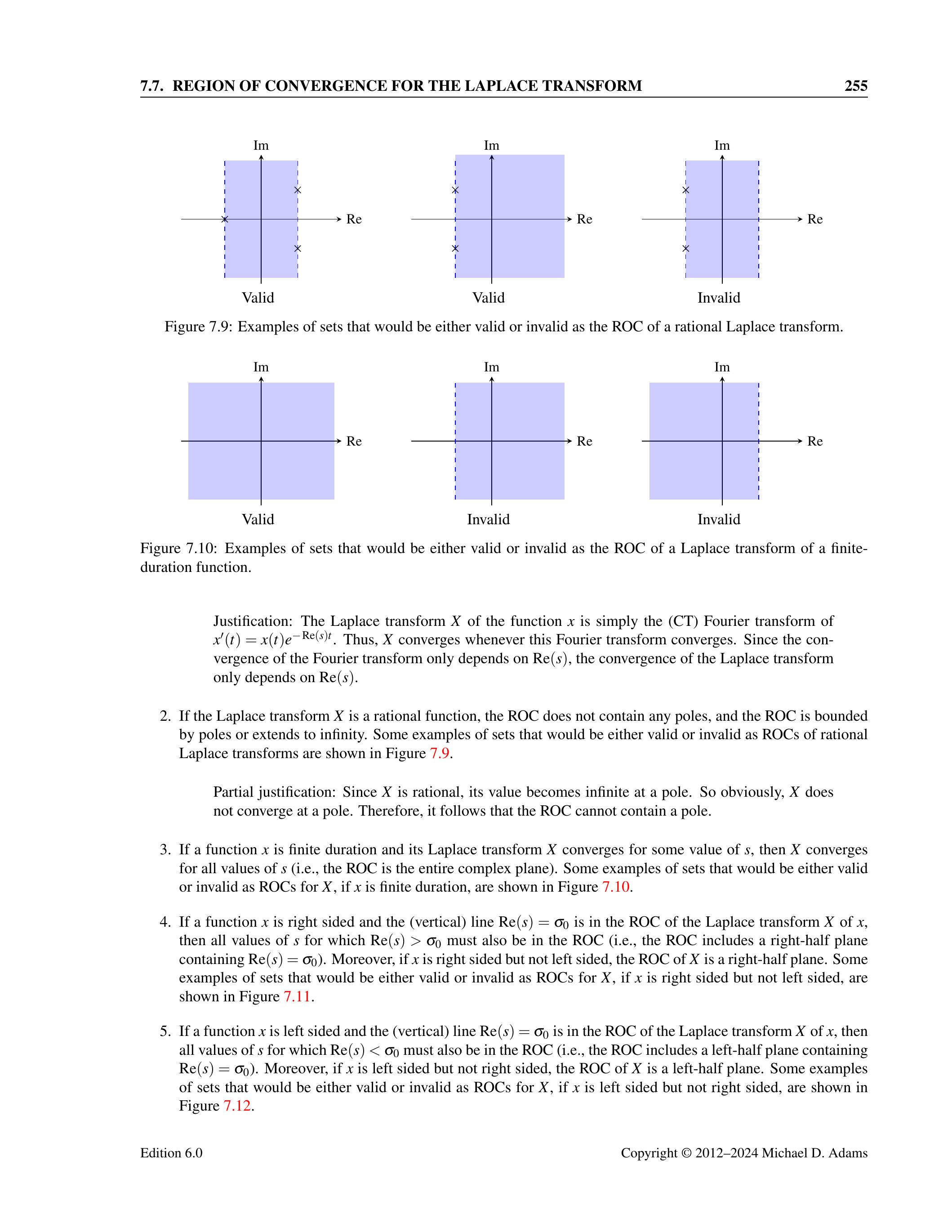 - 如果拉普拉斯变换 \(X\) 是有理函数,则ROC不包含任何极点,且ROC由极点所界定,或者向无穷延伸。图7.9展示了一些可能作为有理拉普拉斯变换的有效或无效ROC的集合示例。