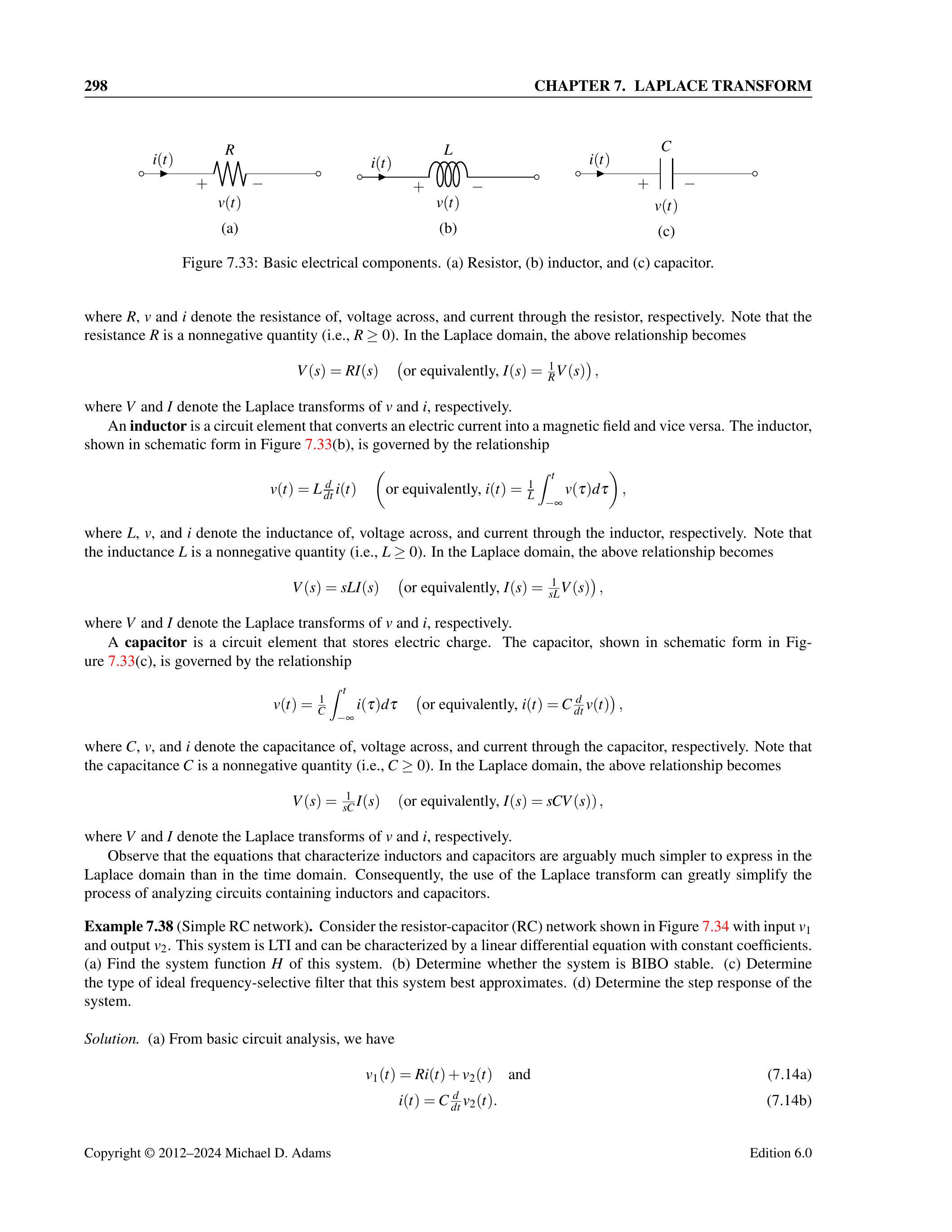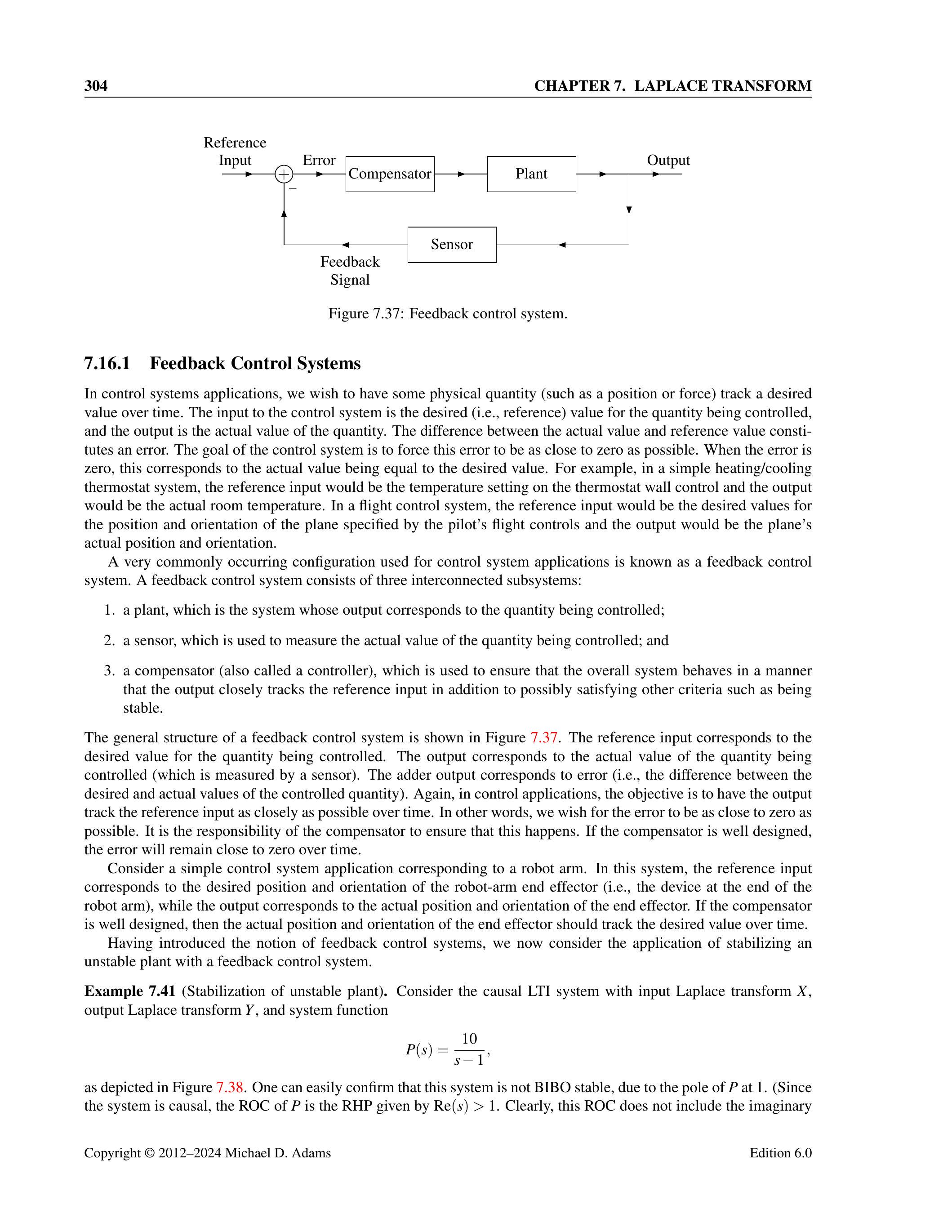 此前,我们称 \(H\) 为系统函数。在本章中,我们将了解到 \(H\) 实际上就是 \(h\) 的拉普拉斯变换。也就是说,式 (7.1) 中的积分就是拉普拉斯变换的定义。当 \(s=j \omega\),其中 \(\omega\) 为实数(即 \(s\) 是纯虚数)时,(7.1) 就成为了傅里叶变换积分(在第6章中讨论过)。根据之前的内容,我们知道 \(H(j \omega)\) 是 LTI 系统的频率响应(即 \(h\) 的傅里叶变换)。由于 (7.1) 将傅里叶变换作为一个特殊情况包含在内,拉普拉斯变换可以被视为(经典)傅里叶变换的推广。