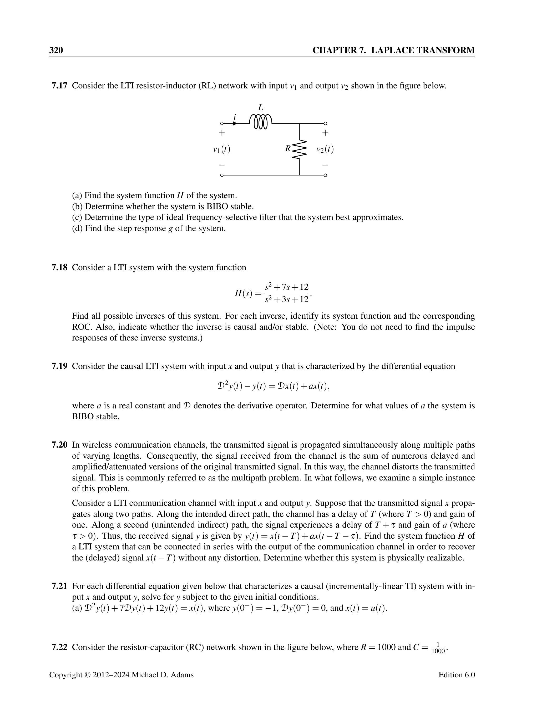 7.110 对于因果 LTI 系统,输入为 \(x\)、输出为 \(y\),其微分方程如下,求系统函数 \(H\)。