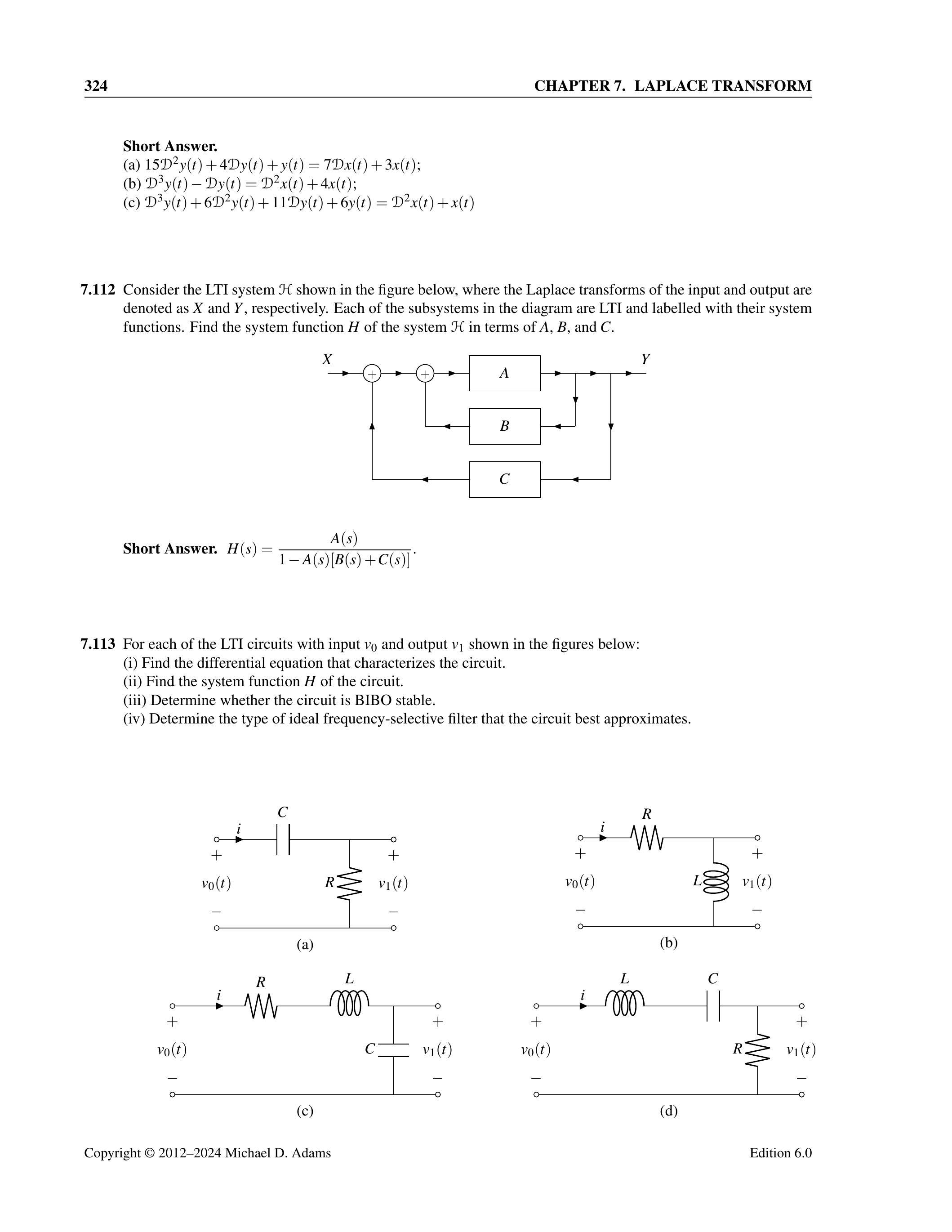 7.111 对于输入为 \(x\)、输出为 \(y\) 的 LTI 系统及下列系统函数 \(H\),求描述系统的微分方程。