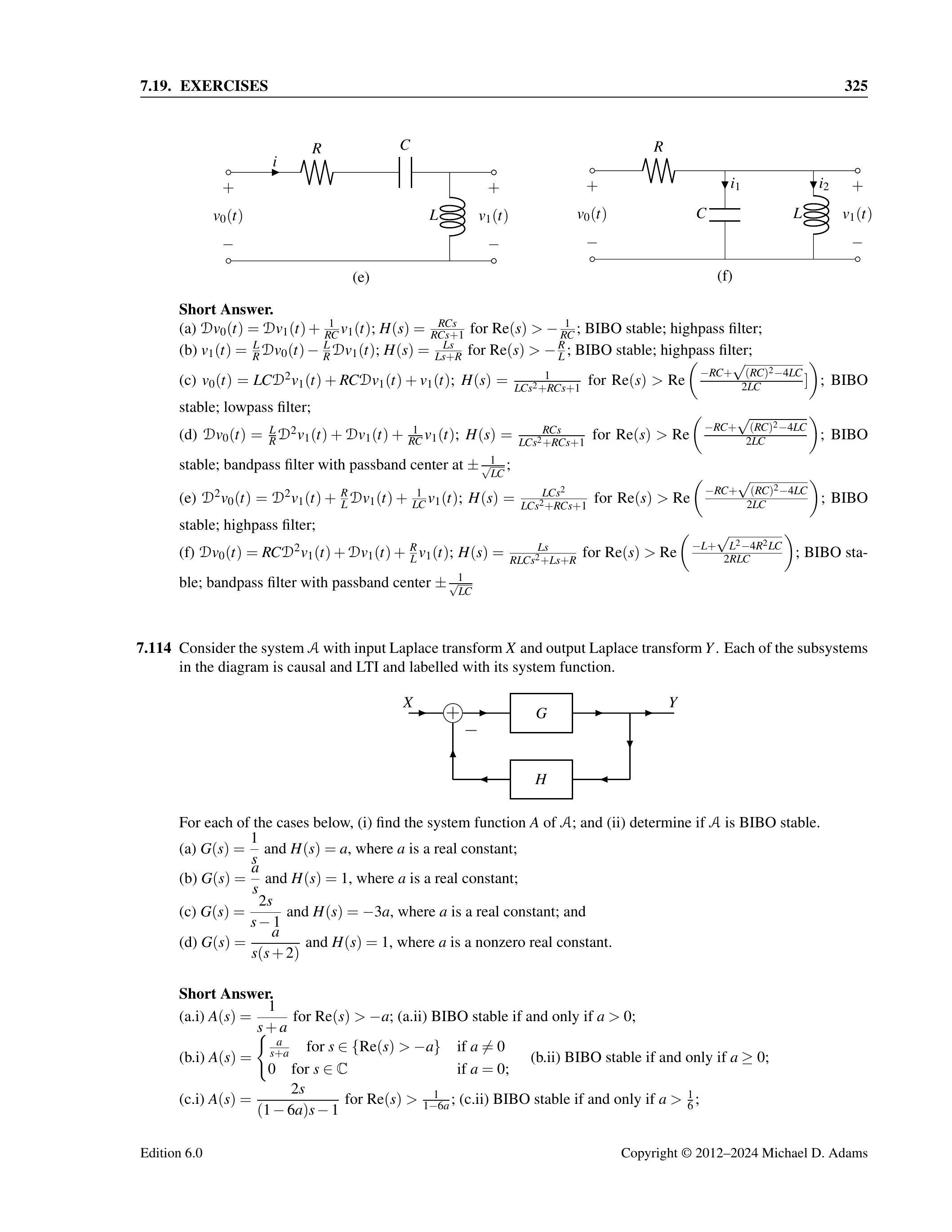 (f) \(\mathcal{D} v_{0}(t)=R C \mathcal{D}^{2} v_{1}(t)+\mathcal{D} v_{1}(t)+\frac{R}{L} v_{1}(t)\);\(H(s)=\frac{L s}{R L C s^{2}+L s+R}\),适用于 \(\operatorname{Re}(s)>\operatorname{Re}\left(\frac{-L+\sqrt{L^{2}-4 R^{2} L C}}{2 R L C}\right)\);BIBO 稳定;带通滤波器,通带中心 \(\pm \frac{1}{\sqrt{L C}}\)。
